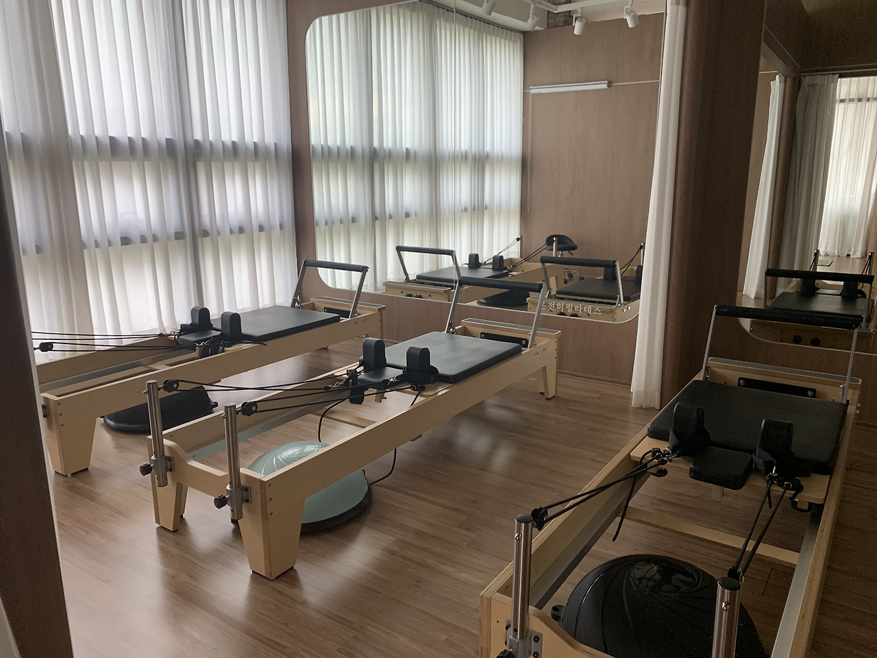 하, 팔이 저렇게 멀리 뒤로 간다니. 뻣뻣한 내 어깨 탓이다. 2년 넘게 등산에만 집중했더니 아무래도 상체가 많이 굳었다. 그럼 하체는 괜찮고? 다음으로 넘어간 하체 운동에서도 진땀 흘리기는 마찬가지. 리포머에 누워 발끝, 아치, 발뒤꿈치 번갈아가며 풋바에 올리고 다리를 폈다 굽혔다 반복하는데, 초반에는 할만하다가 3세트가 넘어가자 허벅지 안쪽이 아파온다.