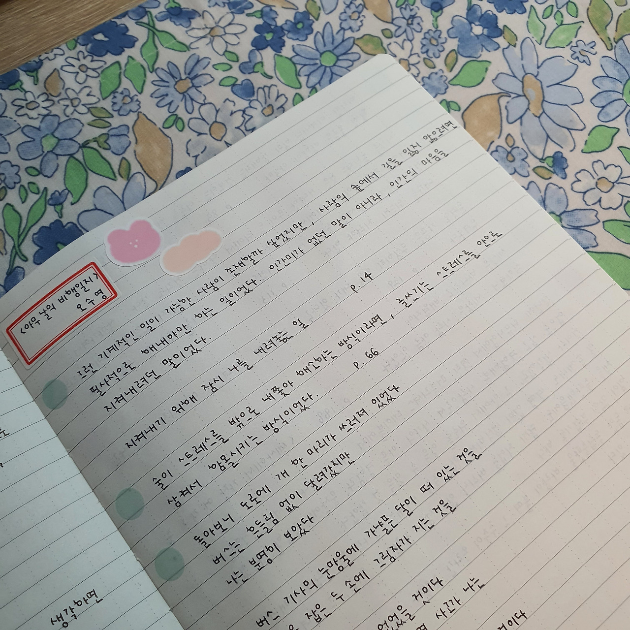 필사 노트는 몇 해가 지나도 가끔 펼쳐 읽곤 하는데, 이전에 썼던 노트 중 한 권은 제본이 약해 보관 도중 일부 페이지가 뜯어져 버렸고, 한 권은 로디아 노트인데 종이 질이 어떻게 된 것인지 보관 중 글씨가 꼭 번진 것처럼 변했다.