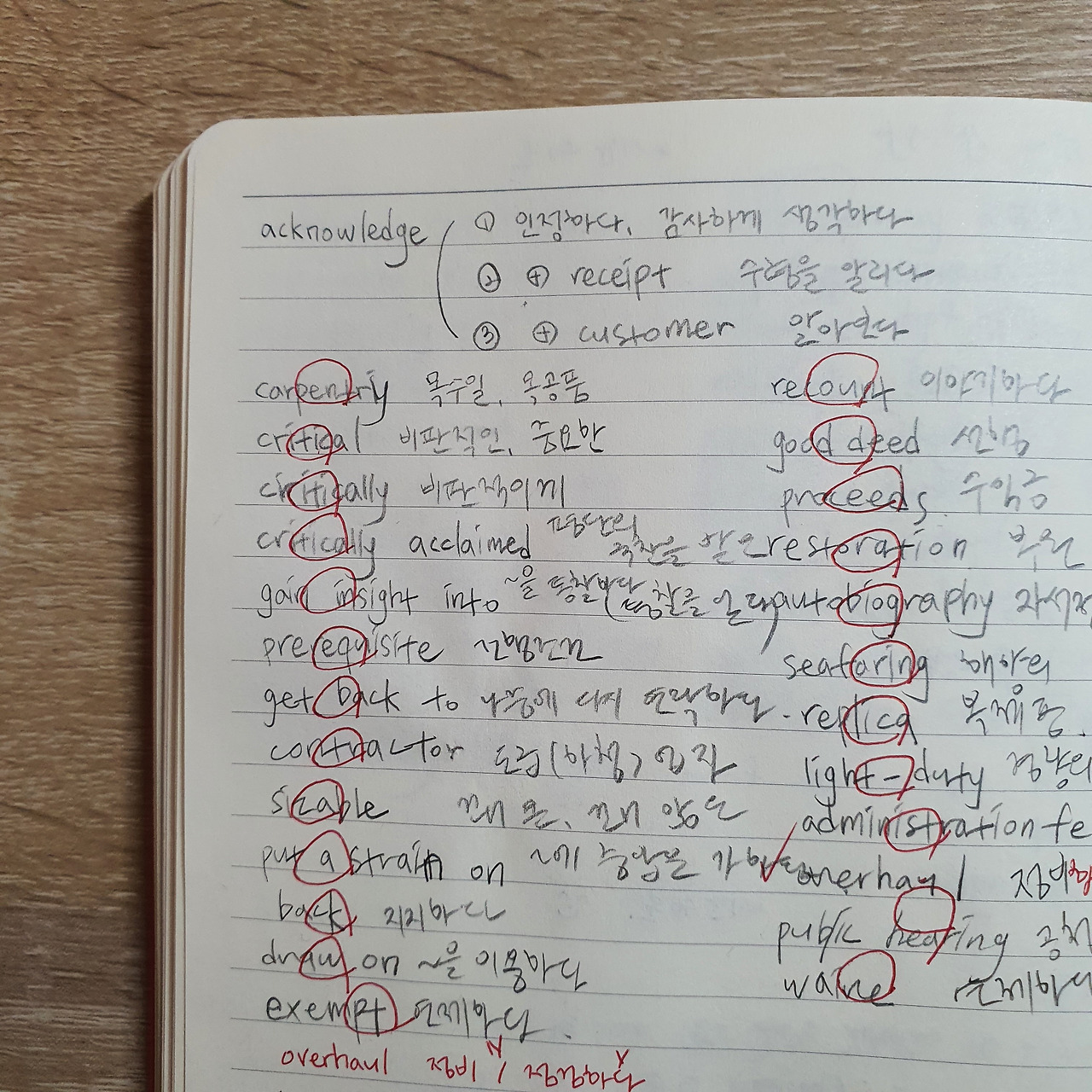 뜬금없이 영어 단어 공부를 하기도 하고, 여행 짐을 어떻게 챙길지 적기도 하고, 집에 두고 무엇이든 생각나는 대로 쓰는 노트다.