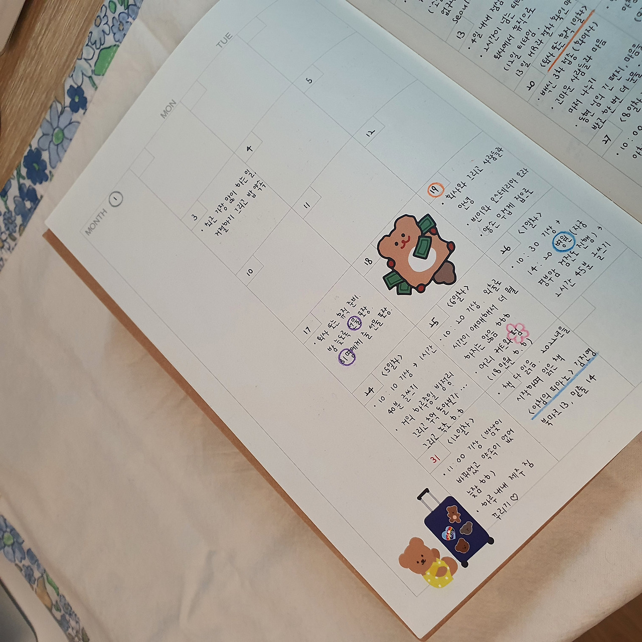 보통 다이어리를 사면 꼭 쓰지 않는 페이지가 생기고, 바쁜 시기에는 여러 페이지를 쓰고 꾸미는 게 어려워지므로 현재는 먼슬리 노트와 일기장을 따로 사서 쓰고 있다.