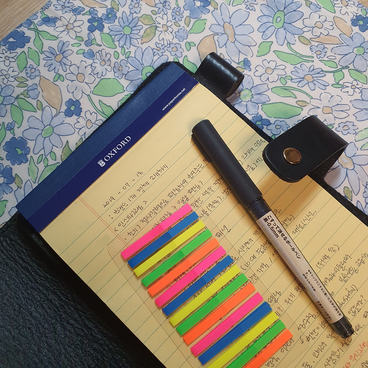 독자 입장에서 다른 사람의 노트를 구경하고 살짝 들여다보는 일이 흥미롭고 재미있는 일이었을지 모르겠는데, 이 글을 쓰는 나의 마음은 무척 재미있었다. 그리고 사실은 일곱 권의 노트가 다는 아니고 일하며 쓰는 노트와 책상 위에서 급히 메모할 것이 생겼을 때 뜯어 쓰는 작은 노트가 더 있다. 아직 올해의 절반을 왔을 뿐이니 더 늘어날 수도 있고.