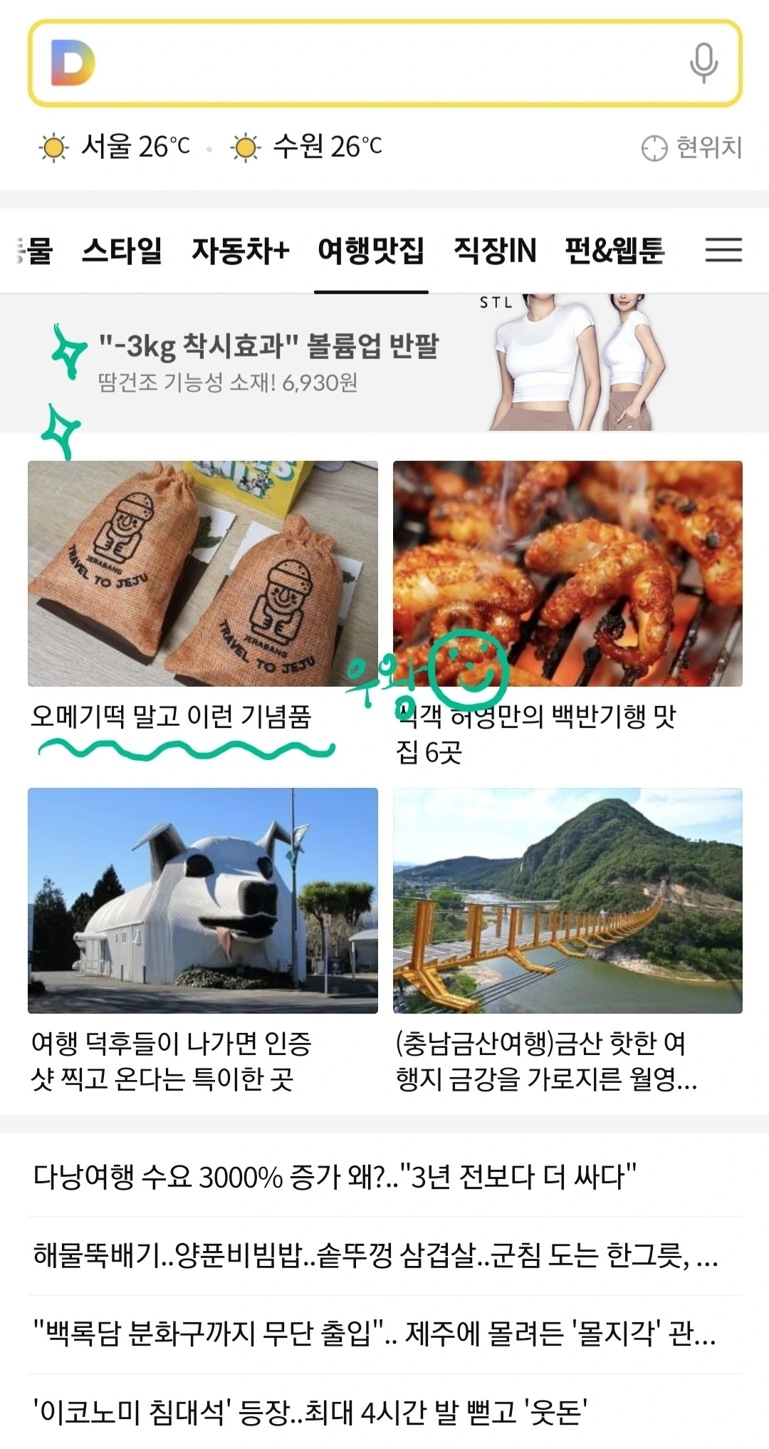 진짜였다. 다음에 접속해 화면을 몇 번 넘기니 '여행맛집' 탭에 나의 글 '오메기떡 말고 이런 기념품'이 가장 첫 번째로 노출 중이었다. 브런치는 이제 막 시작 단계이고, 블로그는 제대로 운영해 본 일이 없어 이런 건 태어나 처음 경험하는 일이었다.