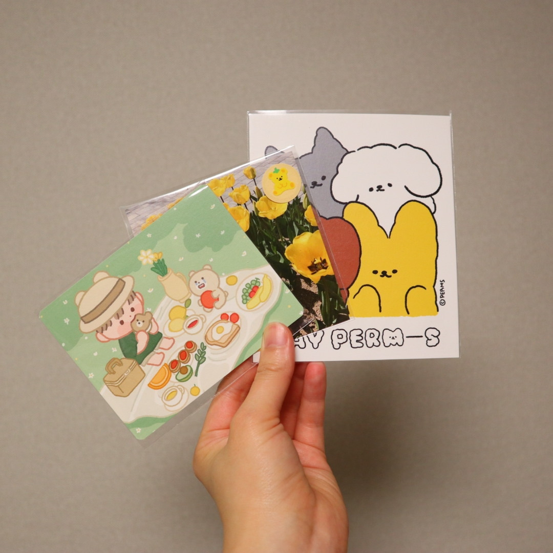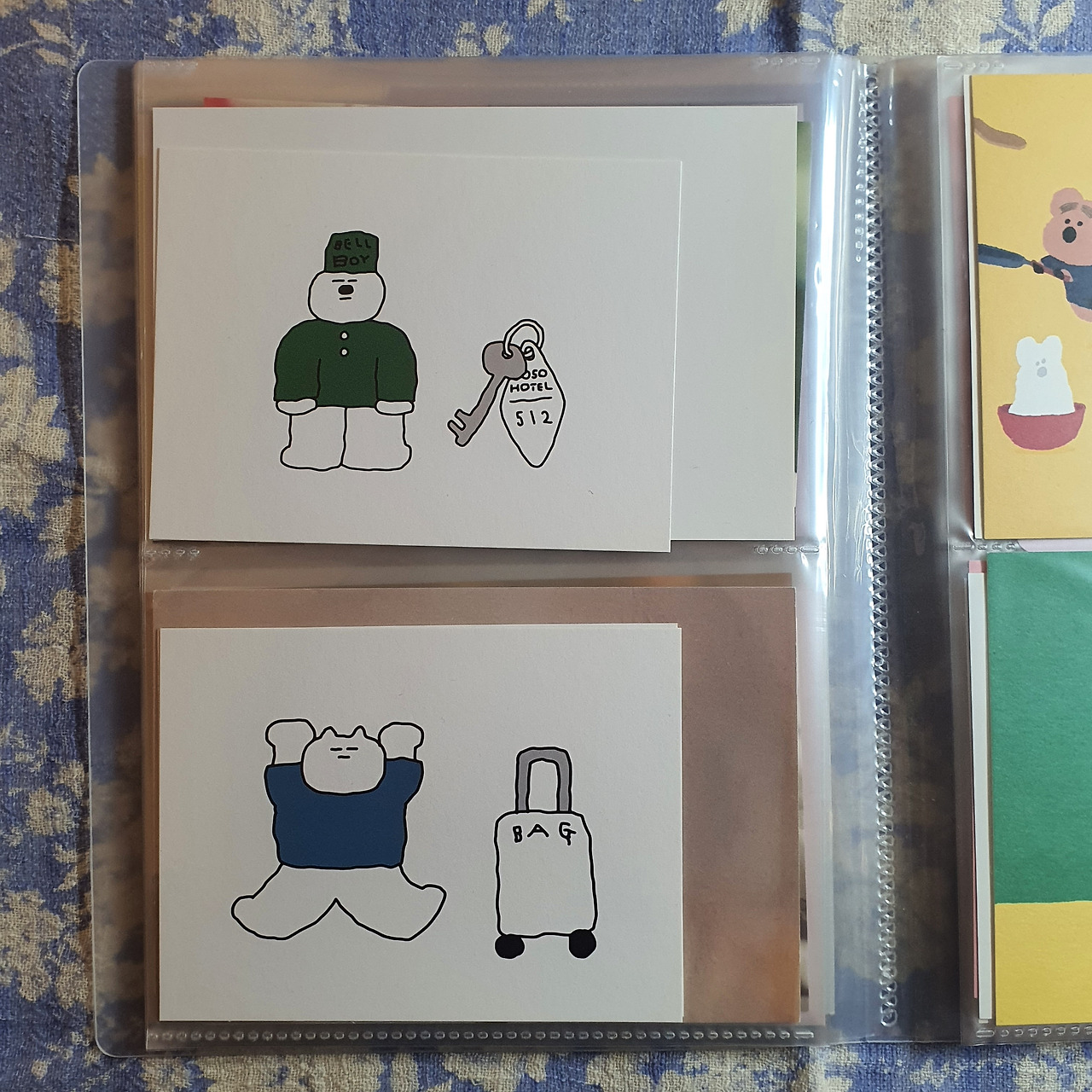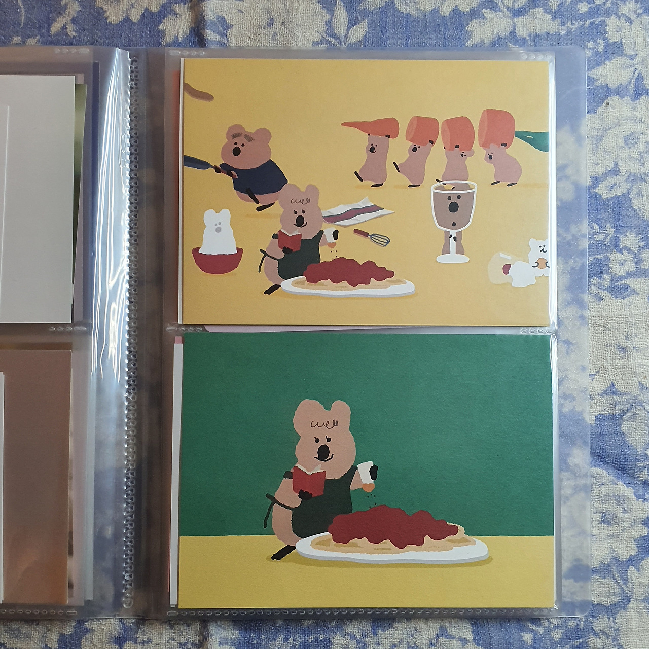 엽서를 보관하는 방법은 이렇다. 무인양품에서 구입한 파일에 꽂아 두고, 필요할 때 펼쳐보며 그때그때 마음에 드는 것을 빼서 쓴다. 수집과 소장에 목적을 둔 것은 아니기 때문에 이렇게 빼서 사용하느라 중간에 빈자리가 생기면, 다음에 엽서를 샀을 때 이 자리부터 채워 넣으면 된다. 처음 정리할 때는 같은 종류 또는 비슷한 느낌끼리 모아두지만 사용하며 흐트러진다고 해도 마음 쓰지 않는다.