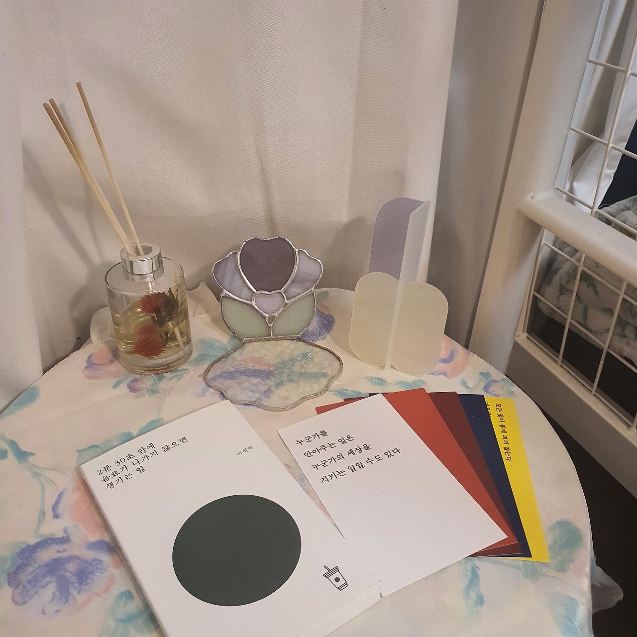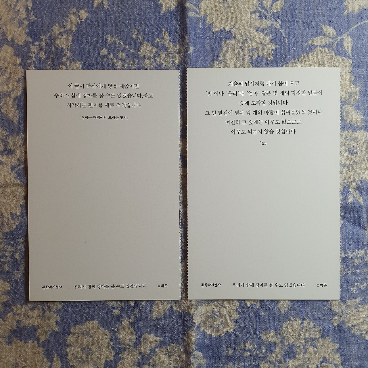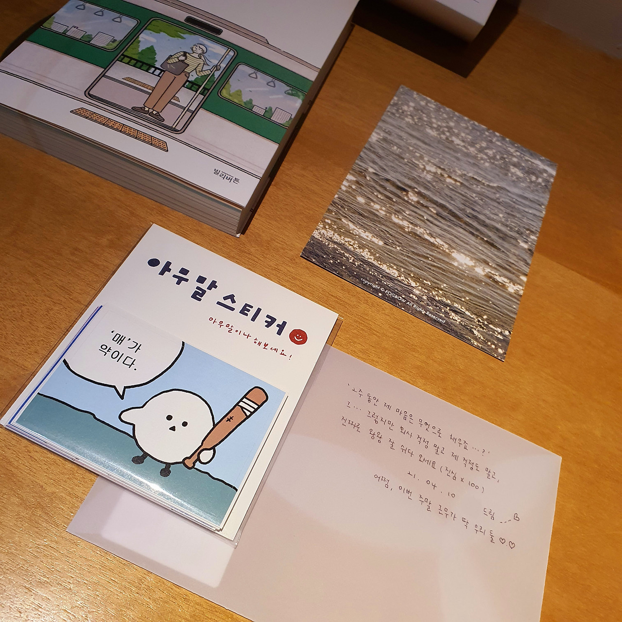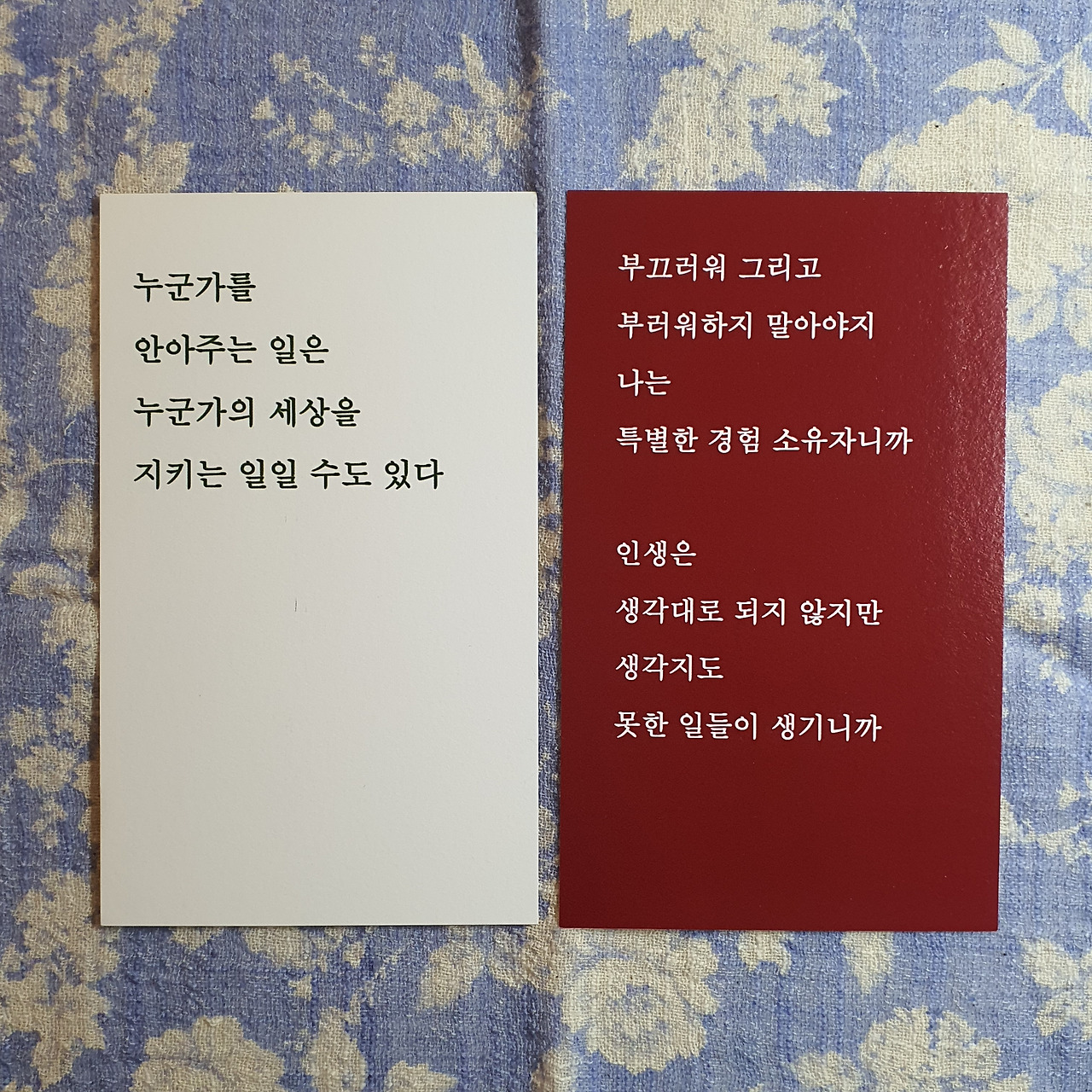 책 속 문장이 담긴 엽서는 알라딘을 통해 구입하기도 하고(주로 책 구매 시, 500원 내외의 가격으로 엽서를 살 수 있다.), 독립출판물을 좋아하는데 작가님이 엽서를 굿즈로 제작하여 증정하거나 북페어에서 판매하는 경우가 종종 있어 이런 곳에서 받거나 사 온다.