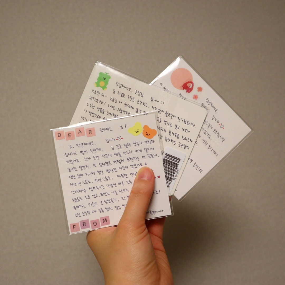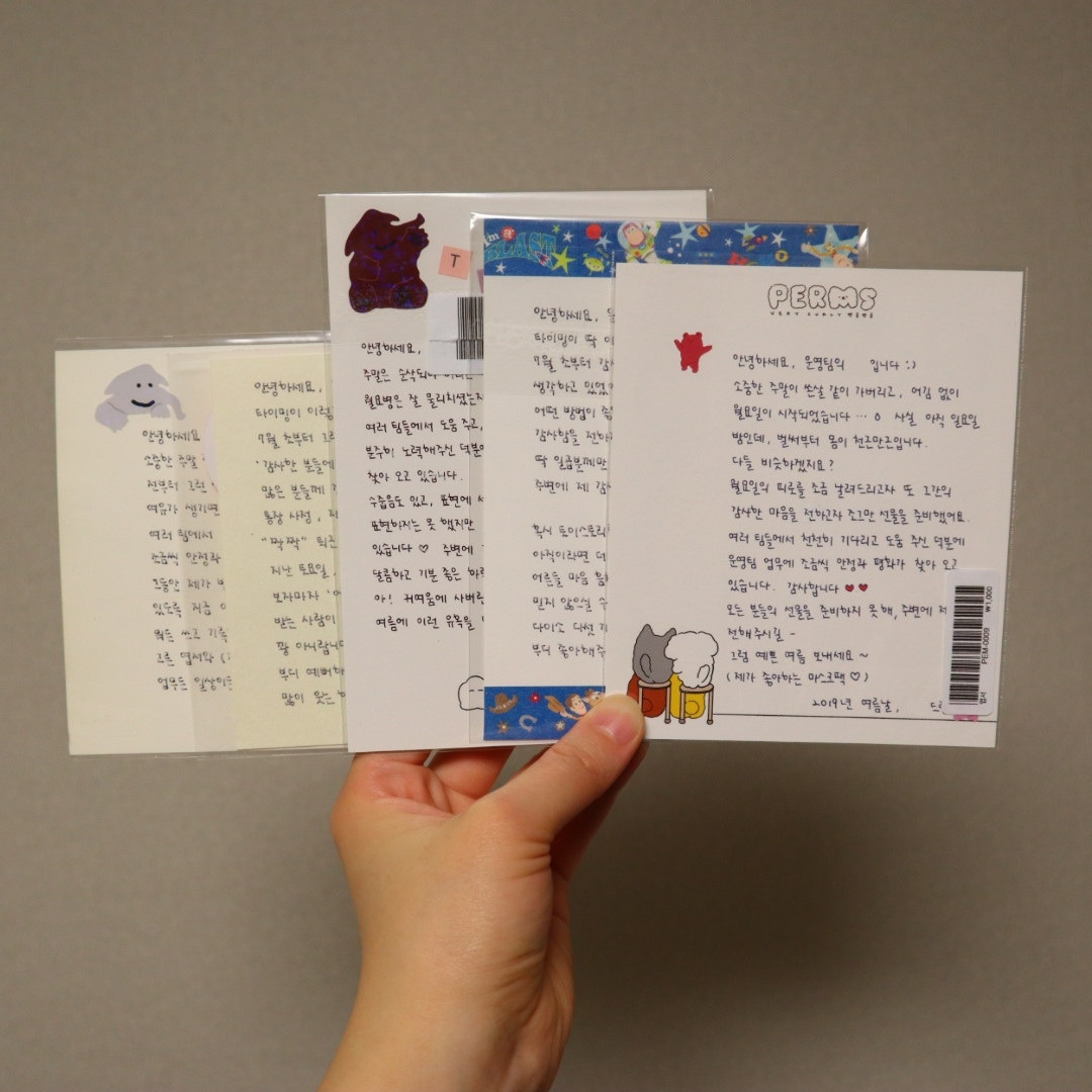 그러다 마음에 변화가 생기게 된 데에는 여러 이유가 있다. 직장 동료를 위한 작은 선물을 준비할 때 손글씨를 적어 마음을 전하곤 하는데, 크기가 큰 편지지는 다 채우기 부담스러울 때가 종종 있다. 그만큼 쓸 말이 없을 때도 있고, 할 말은 많지만 혹시나 받는 사람이 부담스러울까 봐 말을 줄일 때도 있다. 그래서 엽서를 사게 됐다. 편지지는 공간이 비어있으면 허전한 느낌이 들지만, 엽서의 여백은 그렇지 않다. 엽서는 내용 없이 사진이나 그림에 의미를 두고 보내는 경우도 있으니까 여백이 있어도 그럴듯해 보이고, 편지지와 비교했을 때 종이가 도톰하고 무겁기 때문에 조금 더 성의가 들어간 느낌이다.