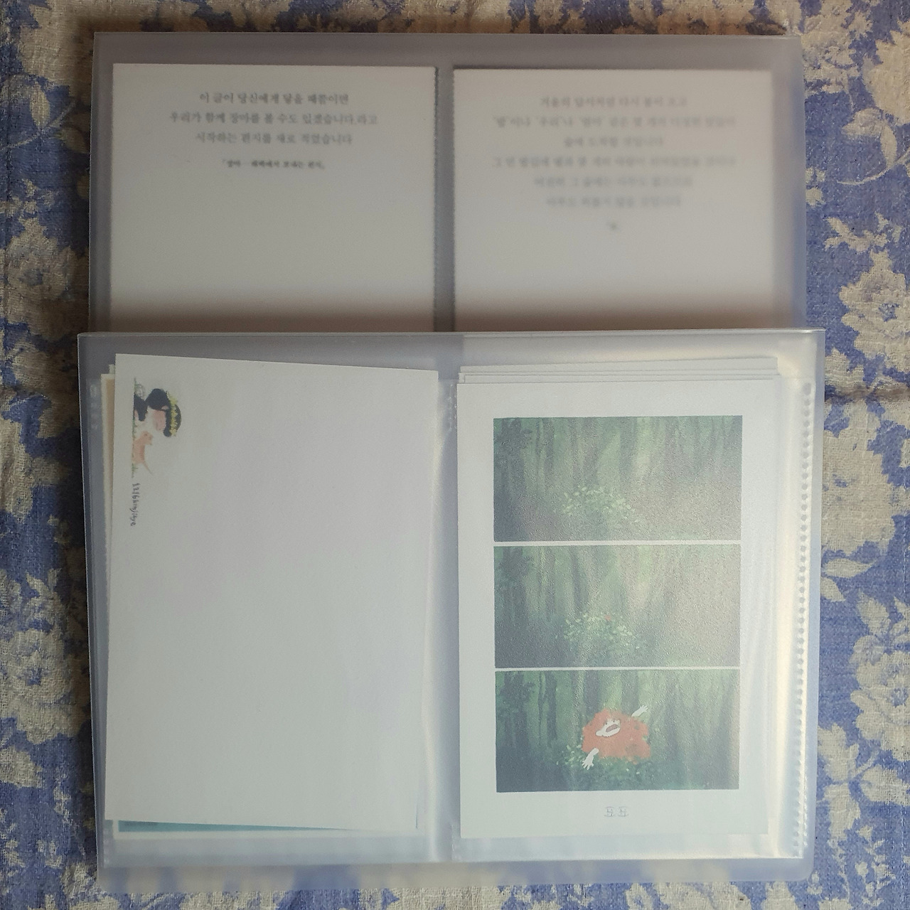 이렇게 정리하게 된 것은 무엇이든 깔끔하게 정리하는 것을 좋아하기 때문은 아니고 :) 전에는 서랍 한 칸에 엽서와 편지지를 마구 넣어두었는데, 때마다 원하는 것을 딱 찾아 사용하기가 어려웠다. '아, 분명 이런 엽서를 샀던 것 같은데, 어디 있지?' 서랍을 쓱 보다가 '됐다. 귀찮아. 아무거나 쓰지, 뭐' 이런 식이었다. 엽서를 파일에 정리한 지금은 잘 찾아서 사용 중이고, 종종 펼쳐보며 즐거움을 느끼고 있다.