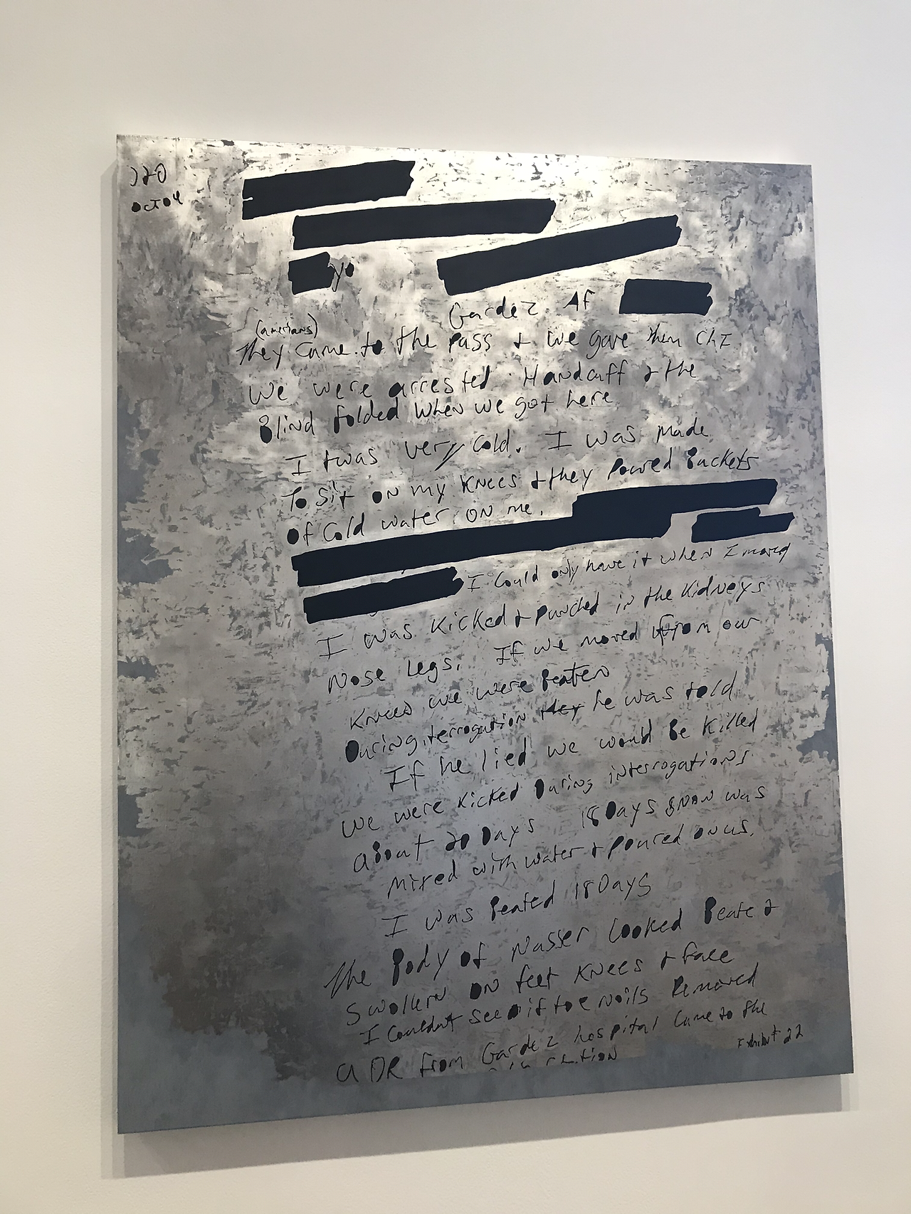 이러한 화려한 이력보다 작품이 주는 파워풀한 메시지 자체로 관람객들을 사로잡는다. 이번 국제 갤러리에서는 미국 정보 공개법에 따라 공개된 정부 문서를 회화로 번안해 내는 방식의 작품이 선보였다. 이미 상당히 검열된 상태로 기밀 해제된 미국 정부 및 군부 문서가 작가의 손을 거쳐 거대한 추상화로 변모하고, 이때 정부 문서 상의 검정색 검열 막대기는 다채로운 금박 및 은박으로 호환된다.