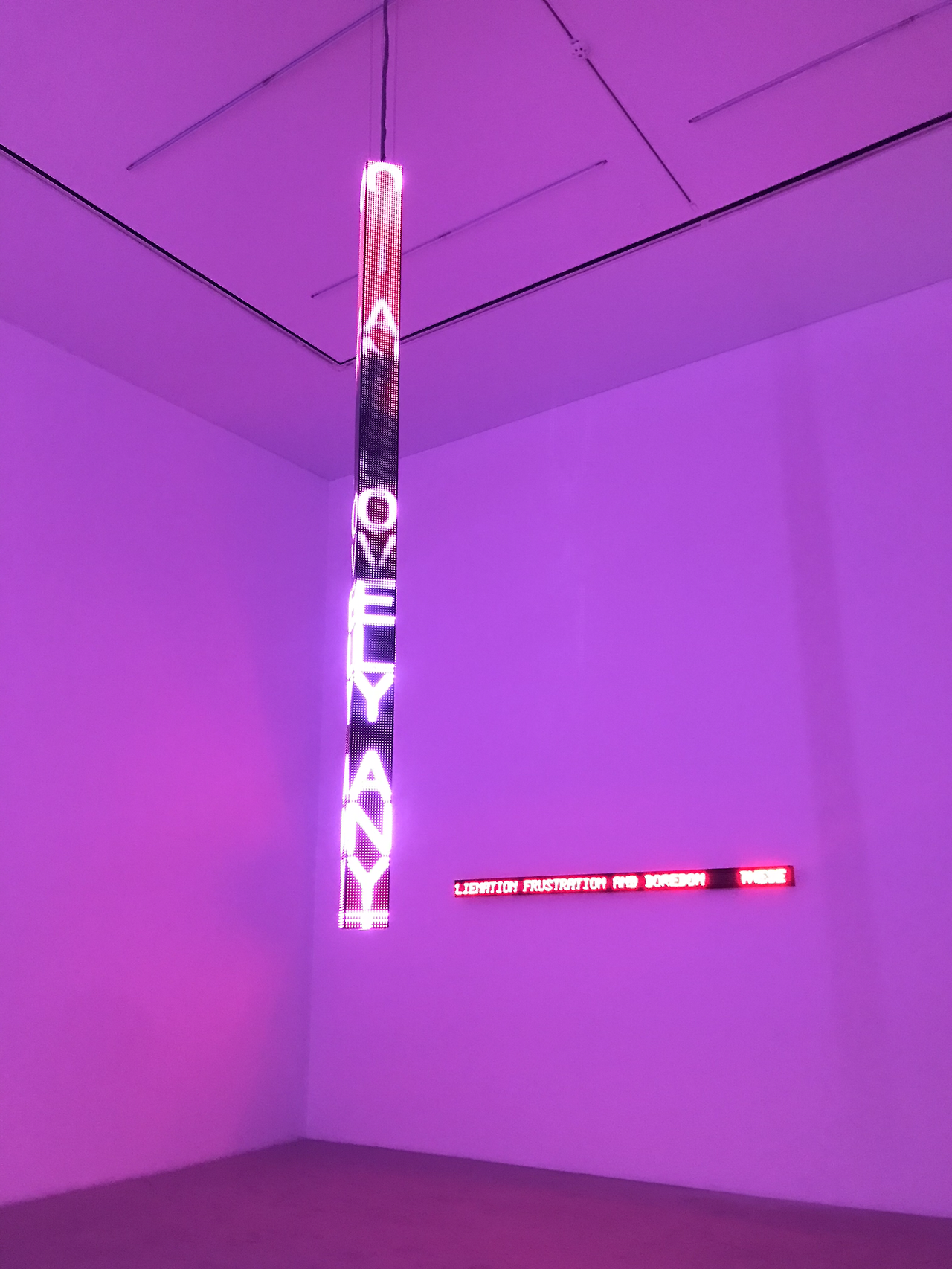 “LED 사인의 주요 기능 중 하나는 움직일 수 있는 능력에 있는데, 나는 이것이 구두로 전달하는 말과 비슷하여 좋아한다. LED 사인을 통해서는 글자를 강조할 수 있고, 흐르게 하고나 멈출 수도 있는데, 내게는 이것이 마치 우리가 목소리로 나는 억양의 동적 등가물처럼 느껴진다.”라고 작가는 설명한다.