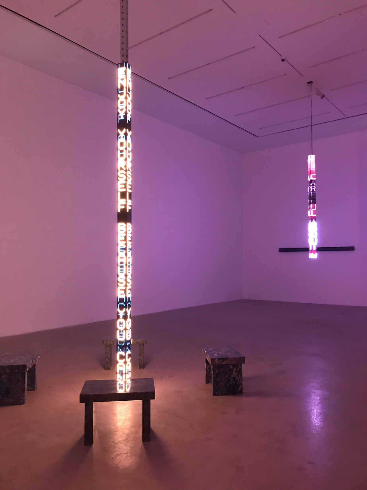 또한 LED 작품은 작가가 선별한 문장 및 글자가 LED를 타고 다채로운 속도로 깜빡이며 흘러간다.