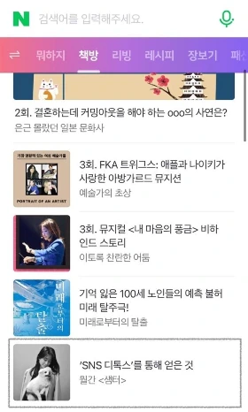 찾아보니 네이버 완전 메인까진 아니지만 '책방' 카테고리에 내 글이 실린 것이다. 샘터에서 공식 포스트에 내 글을 옮겨 주셨고 그게 메인에 걸리게 된 것. 브런치를 하면서 종종 다음&카톡 뷰탭에 올라갔던 일은 있지만 네이버는 처음이었다. 어안이 벙벙.