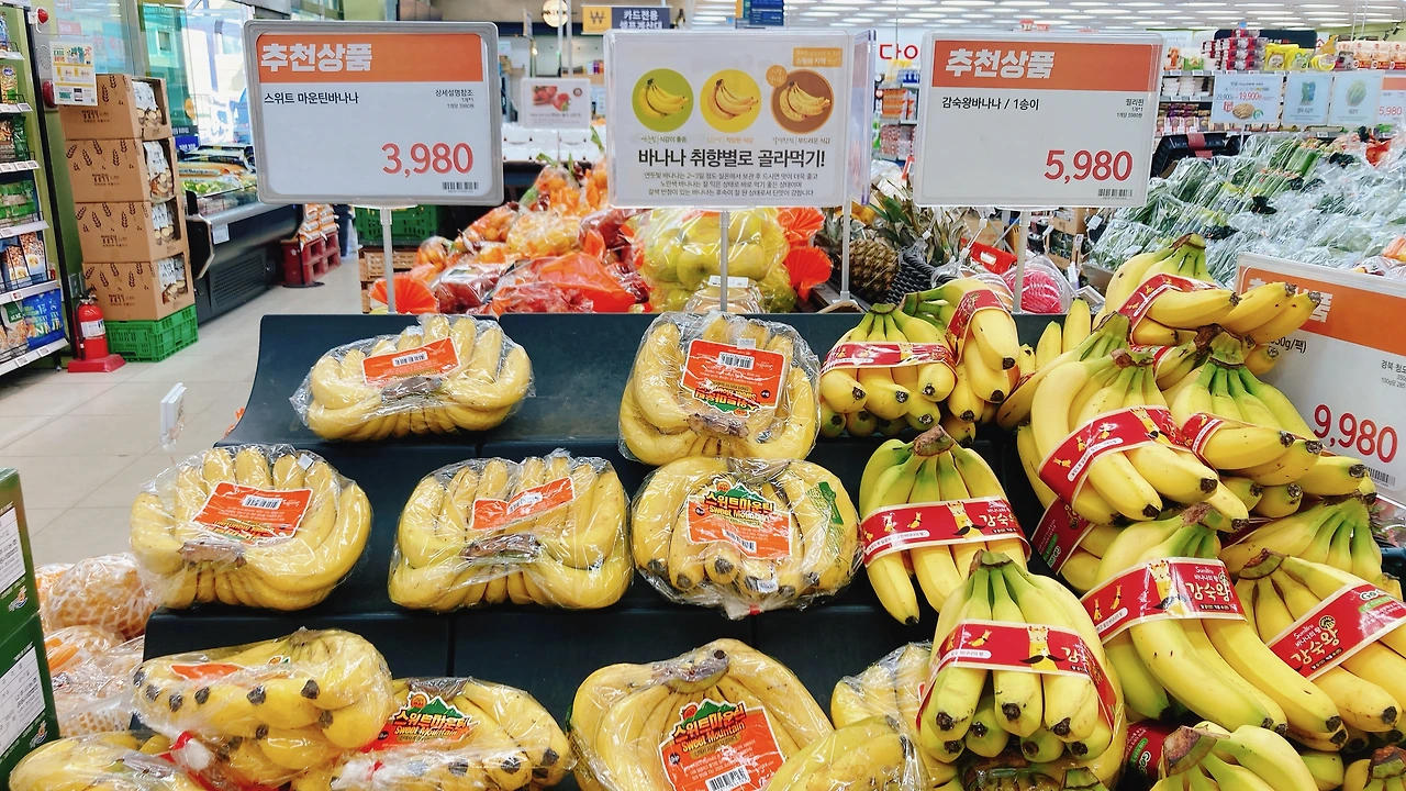그렇게 과일코너를 돌아다니니 열대과일들이 많이 보입니다. 한국 과일들이 워낙에 비싸니, 운송비, 세금을 다 합친 외국 과일이 더 저렴한 거 같습니다. 인도네시아에는 집 앞마당에 달려있는 바나나들인데.. 하하^^ 이렇게 판매되고 있으니 반갑네요.