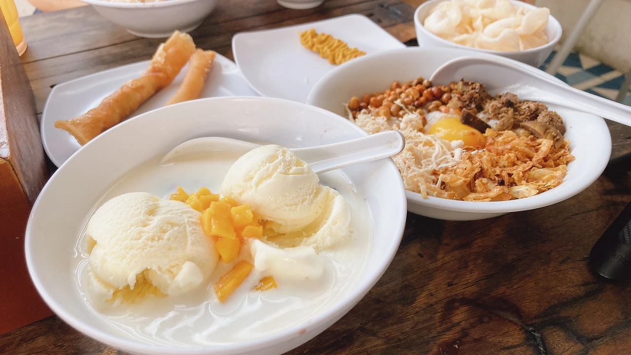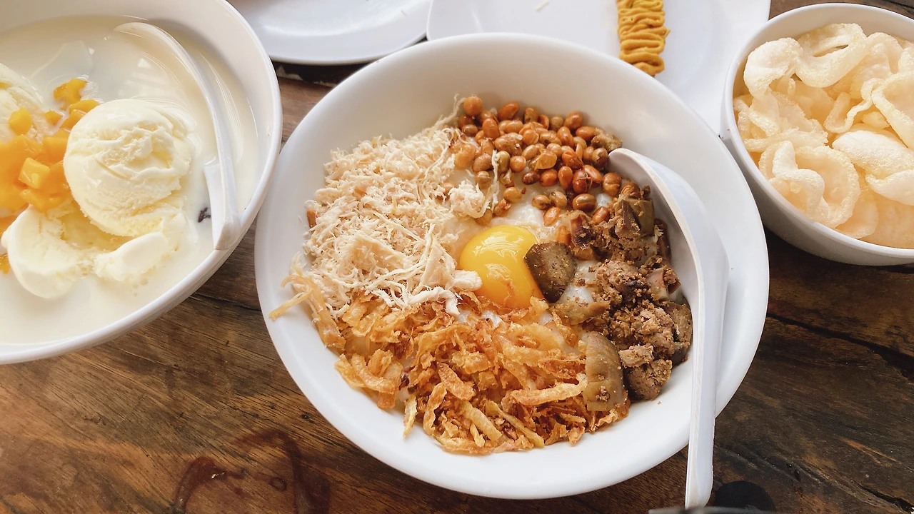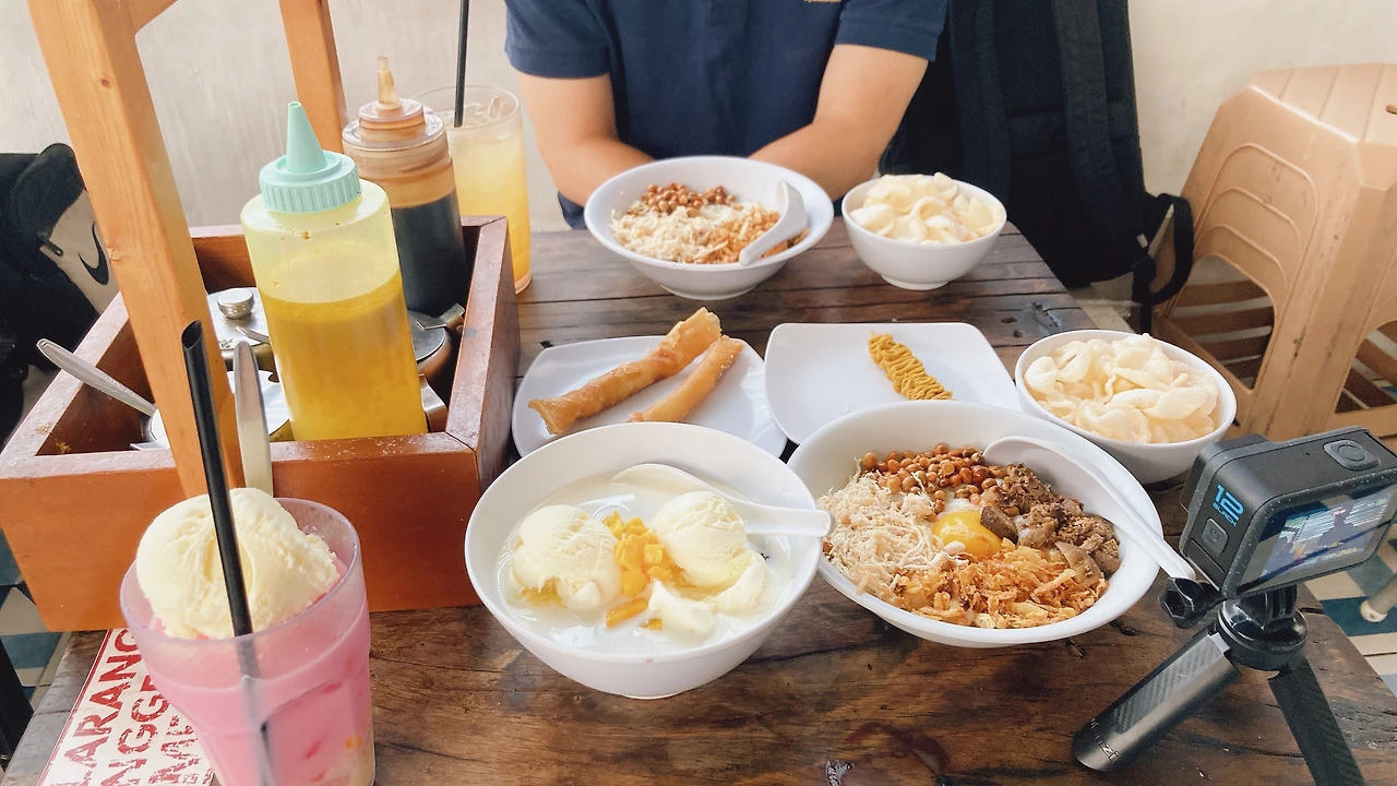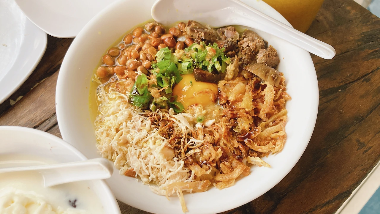 닭죽을 시키니 이렇게 각종 고명을 올려준다. 생각보다 많은 종류의 고명들이다. 일단 비주얼은 합격이다. 잘게 찢어놓은 닭고기와 인도네시아의 자랑인 양파튀김, 고소하게 튀겨진 콩이 올라가 있고, 스페셜 메뉴에는 달걀노른자와 닭 내장(간)이 들어 있다. 그리고 옆에는 각종 소스들이 있어서 함께 곁들일 수 있었다. 특히나 매운 삼발소스가 있어서 매운맛까지 낼 수 있으니 완벽했다. 모든 종류의 소스들을 다 넣어 섞어 먹으니 내가 알던 죽과는 다른 하나의 특별한 요리를 먹는 느낌이 든다. 맛있다.