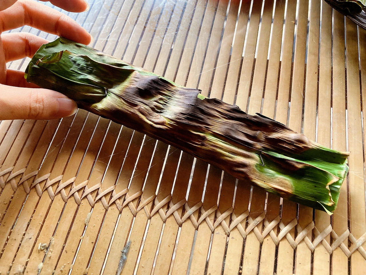 이렇게 바나나잎에 어묵반죽을 먹고 잘 감싼 뒤 구워준다.