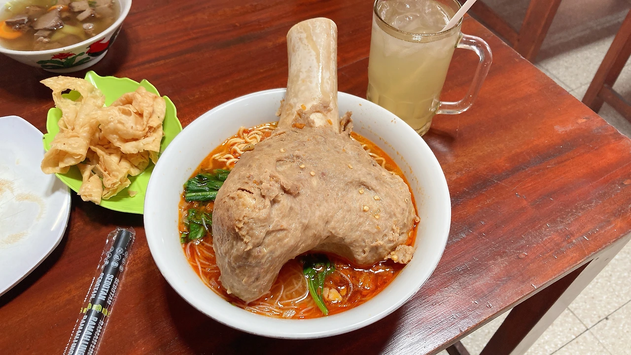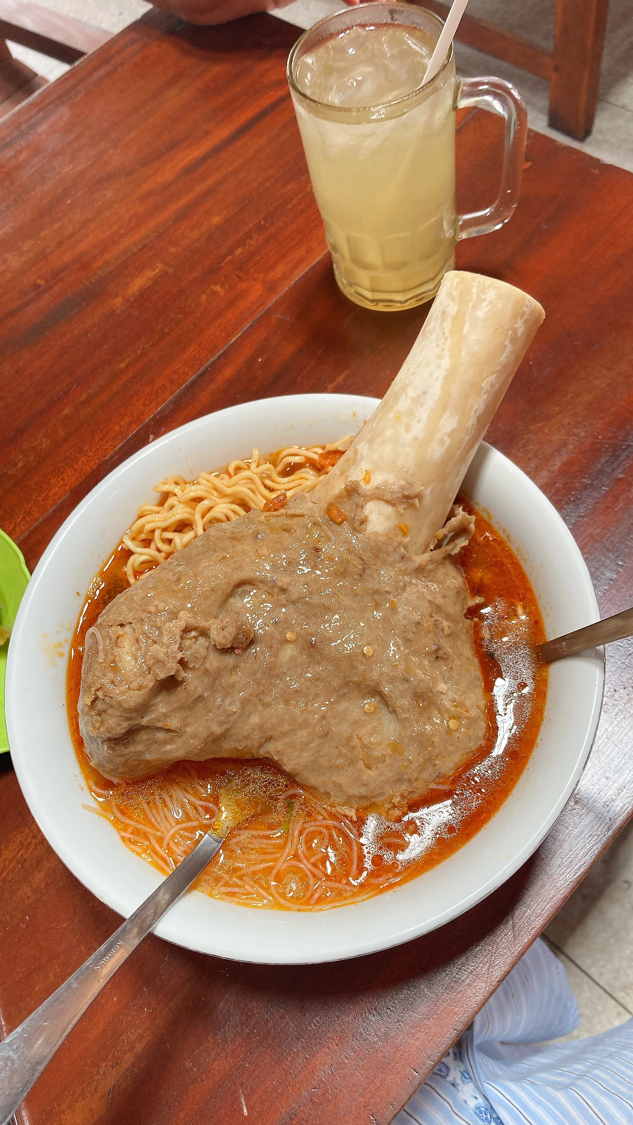 인도네시아는 더운 지역이라 그런지 소고기가 질긴 편이다. 아마도 이러한 이유로 소고기를 갈아 만든 '박소'라는 음식을 인도네시아 사람들은 즐겨 먹는다. 미트볼과 같은 개념인데, 소고기 소시지 같은 느낌에 미트볼 모양이랄까.. 오늘 간 박소 집에는 아주 다양한 모양의 박소가 있었다. 그중에서도 단연 가장 궁금증을 자아냈던 음식이 바로 '사골 박소'였다. 커다란 사골뼈에 박소를 붙여 아주 먹음직스럽게 만들어냈다. 그리고 빨대와 함께 준다. 사실 골을 이렇게 통째로 먹어본 건 처음이었는데.. 그 기름진 느끼한 맛. 엄마가 어릴 때 해주던 사골의 진액 같은 맛.. 여러 가지 생각이 들게 만드는 맛이었다. 그래서 이 사골 박소는 아주 매콤한 국과 함께 준다. 국물만 먹으면 사레가 들릴 정도로 매콤하지만 사골에 국물을 조금 넣어 먹으면 사골의 느끼함을 잡아주고 국물의 매콤함이 완화되어 감칠맛이 나게 된다.