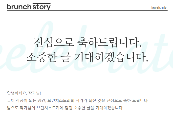 이틀 두 메일 제목에 브런치에서 보낸 것 같은 제목의 메일이 와 있더군요. 광고성 메일인 줄 알았는데 세상에 저보고 축하한다고 기대한다고 하네요. 기대라니요. 저에겐 아이들 키우고 가족을 챙기는 쳇바퀴 같은 무사히 넘기기만 해도 다행이었던 그 일상에 저에게 축하하고 기대한다고 합니다.