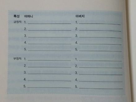우리가 부모의 영향을 많이 받는다는 것, 특히 아이를 키우면서 원부모와의 관계를 다시 맞닥뜨리게 된다는 건 이미 너무 잘 알고 있는 사실이잖아요? 많은 육아 프로그램과 육아서에 나오는 내용이라 사실 큰 흥미 없이 시큰둥하게 읽어내려 갔는데, 책이 제시한 과제의 빈칸을 채우며 정말 많은 걸 얻었어요.
