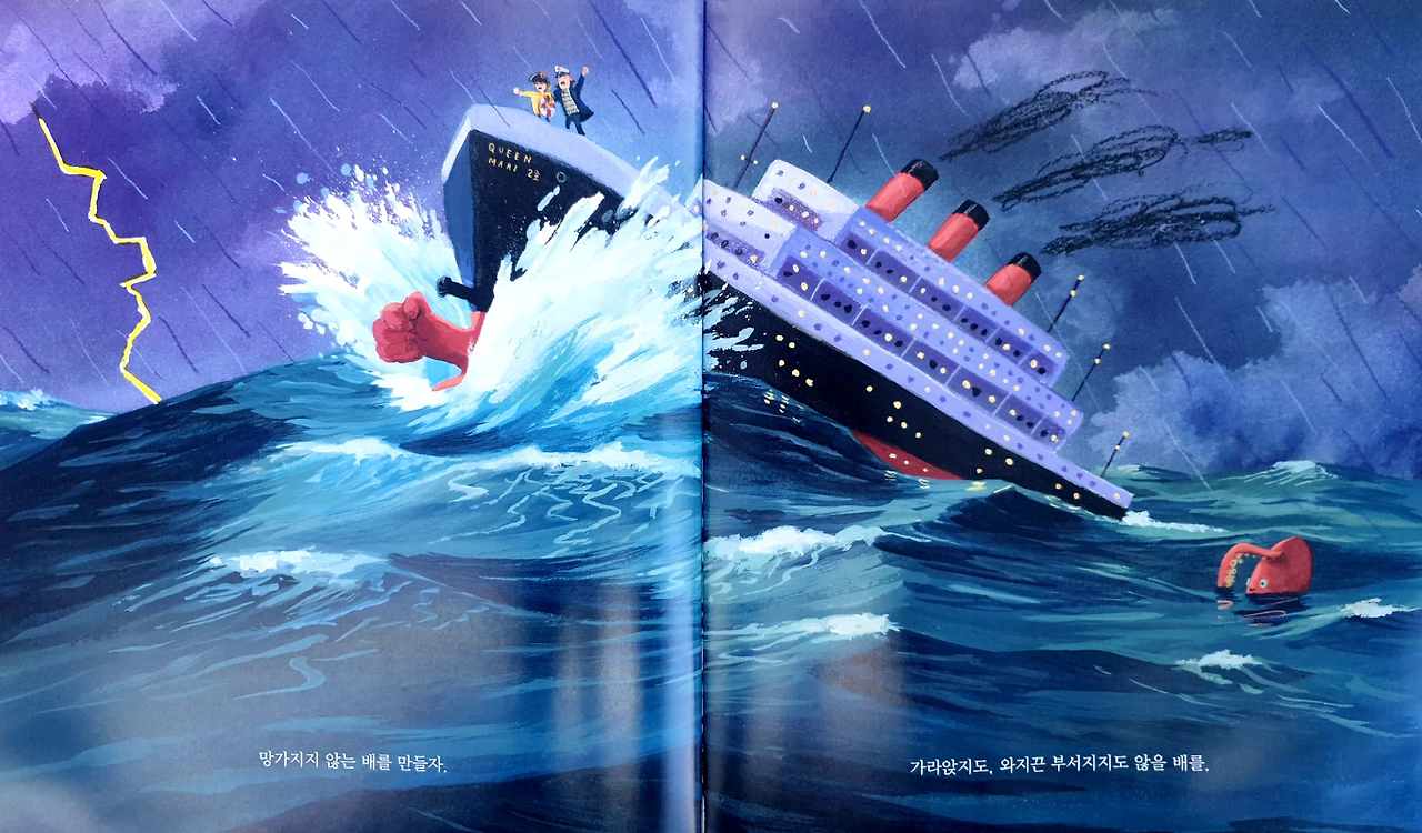 망가지지 않는 배를 만들자고, 가라앉지도, 와지끈 부서지지도 않을 배를 만들자고 말하는 그림책 속의 아빠는 2020년의 우리였다. 코로나19라는 바이러스가 만들어 낸 파도에 휘청거렸던 2020년의 우리, 그럼에도 불구하고 반전을 만들어 낸 우리.