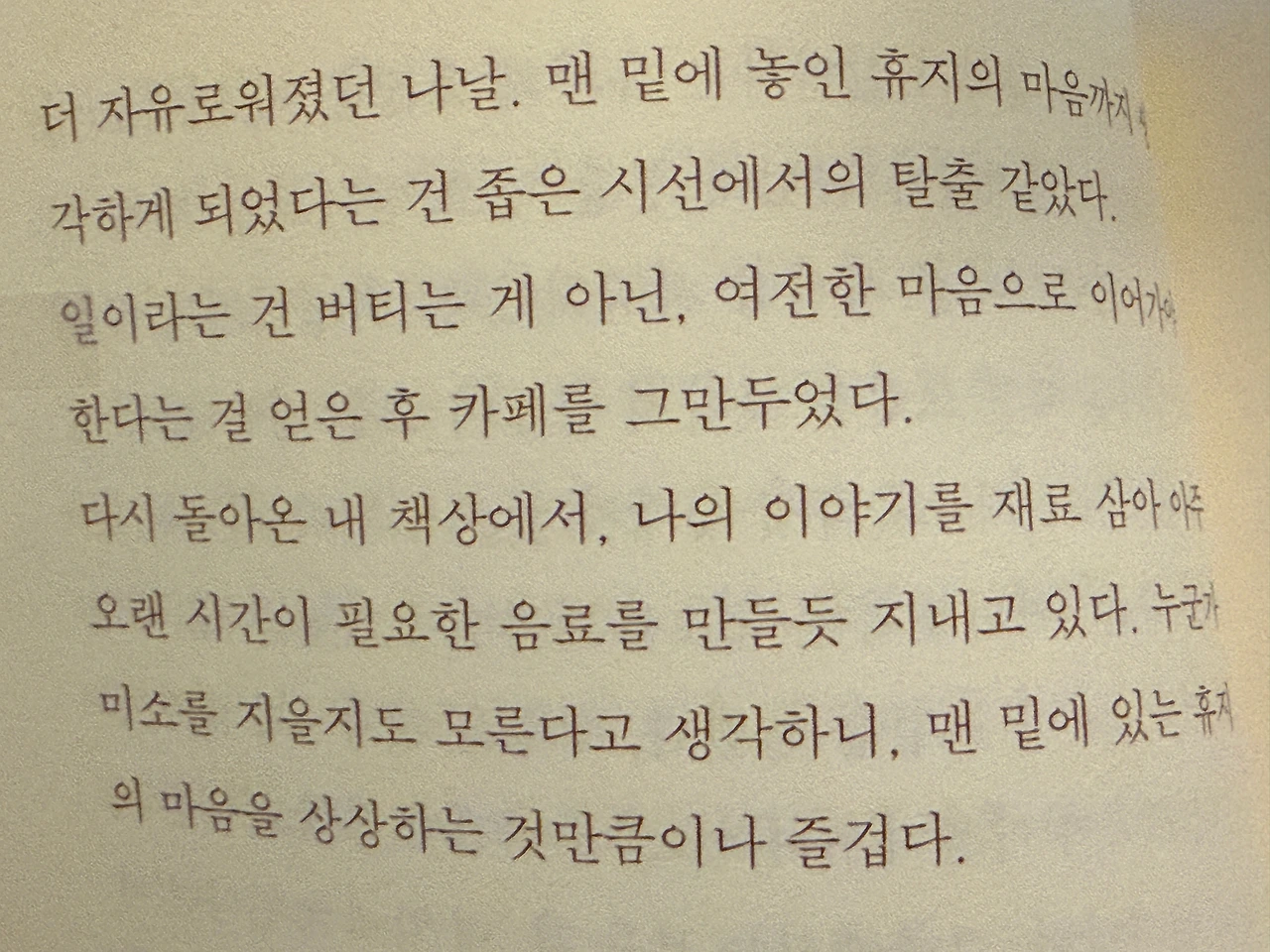 생각보다 쉬운 인생의 비법을 이렇게나 편하게 알려준다. '여전한 마음'이 계속 맴돈다. 올해 초는 멋진 동료 선생님들을 많이 마주하며 마음에 뜨거운 불이 올라왔다. 멋진 사람들, 그들이 하는 노력들을 보며 배우고 싶어지고 해보고 싶어졌다. 아이들이 연달아 골골 아파하며 새벽마다의 시간을 놓치게 되니 상황을 탓하게 되었던 나를 후회한다. 유아 둘을 키우고 있는 '나'의 '여전한'상황을 온전히 받아들이고 그 마음으로 나의 속도를 찾아나가야 할 것이다. 이건 아마 아이들을 키우는 내내 숙제가 되겠지.