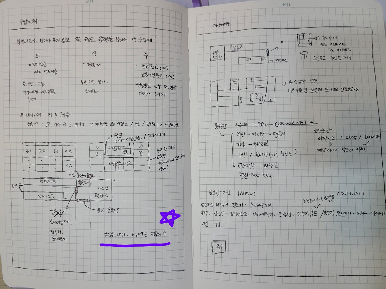 P 건축사님과 계약하던 날, 집에 대한 두루뭉술한 로망으로 가득한 내 다이어리를 꺼내어 놓고 대화를 나누었다. 한참 대화 중 펼쳐 보인 삐뚤빼뚤한 그림과 알아보기 힘든 글씨로 쓴 다이어리를 보고 건축사님은 사진을 한 장을 찍어줄 수 있냐고 하셨다. 건축주가 원하는 것이 무엇인지 아는 것이 중요하기에 내가 써둔 메모들이 좋은 정보가 된다며 참고하겠다고 했다. 일 년 가까이 집에 대해 고민하며 일상을 공간에 어떻게 풀어내면 좋을지 생각했기에 몇 가지 확실한 요구사항이 있었다.