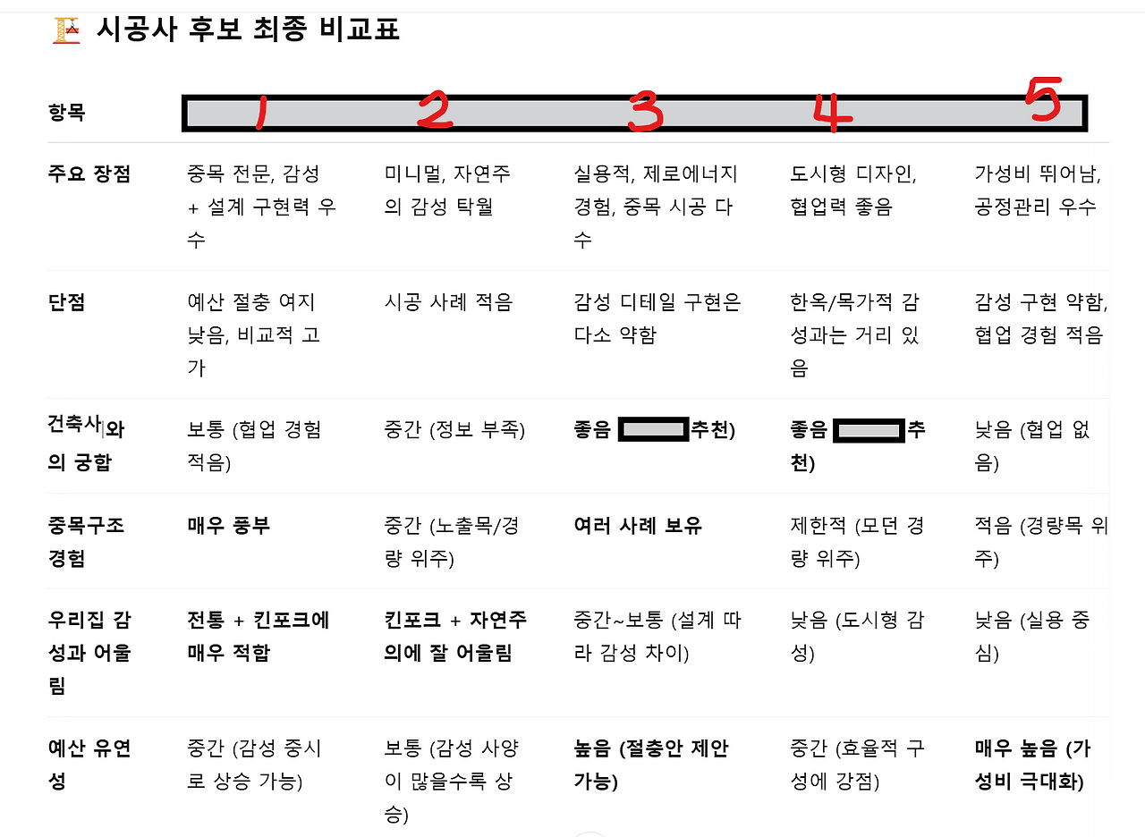 건축사님이 추천한 3, 4번 업체를 고민하고 있었는데 우리 집 감성과의 어울림, 예산 유연성에서 4번은 제외하기로 마음먹었다. 견적을 받으려면 본사를 방문해야 된다고 하는데 너어무 멀어서 고민하고 있었는데 이 부분에서는 챗gpt 말을 좀 들어보련다. 지금 가장 중요한 부분은 무엇보다 예산이라 예산 유연성을 분석한 근거에 대해 한 번 더 물었다. 예산 유연성은 무조건 싸게 해주는 게 아니란다. '자재/공정에 대한 절충안 제안 능력, 직영 시공 비율 또는 공정관리 능력, 건축주 대상 피드백/경험적 평가'의 세 가지 기준에 따라 예산 유연성으로만 시공사를 비교해 봤다.