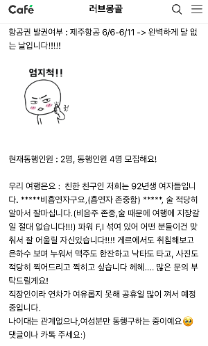 예를 들어 동행 글엔, 비행기 발권 전. 후로 여자 두 명이고, 비흡연자를 원한다 혹은 밝은 사람이면 좋겠다, 달 없는 날이다( 달 없는 날엔 쏟아지는 은하수를 볼 수 있기에 비행기 표가 다소 비쌀 수 있다) 등의 사항과 함께 연락을 먼저 받는다.