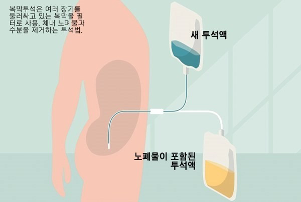 첫째, 복막투석. 복막 투석은 복강 내에 특수한 도관을 삽입하여 투석액을 주입하고 배출함으로써 투석치료를 하는 것으로 치명적인 단점으로 '복막염'의 가능성이 매우 높다.