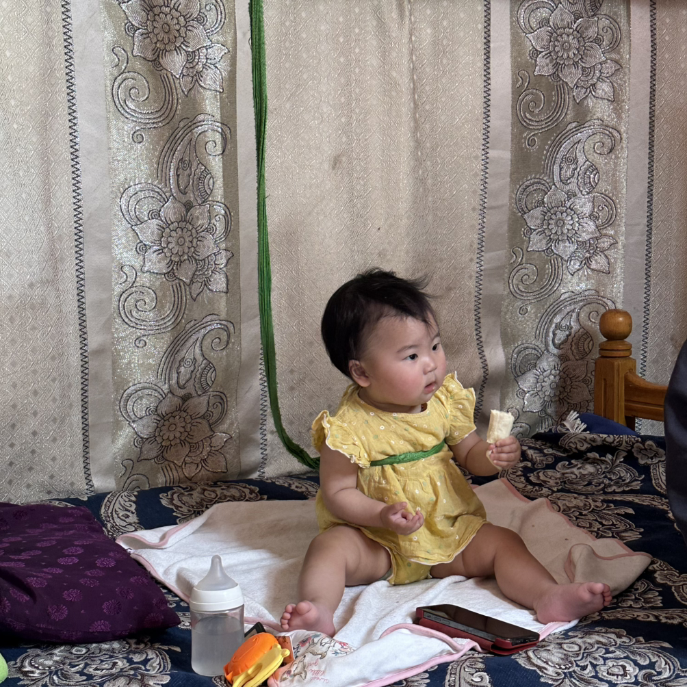 몽골은 침대가 높아서인지 게르 천장에 허리줄을 묶어 육아를 한다.