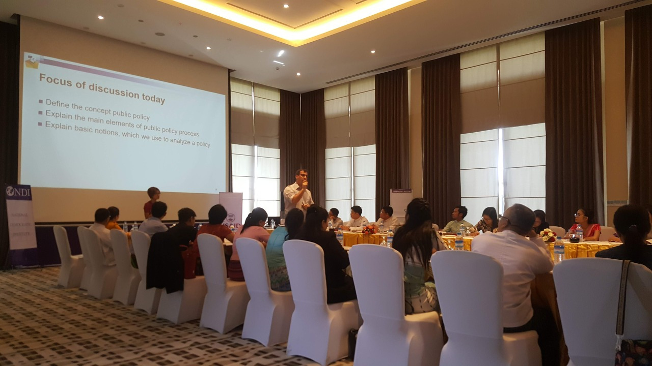 드디어 오후 7시에 40여명 남짓한 미얀마의 국회의원들이 단체 버스를 타고 NDI 강의실로 왔다. 소장이 드디어 처음으로 공공정책을 분석하고 만드는 강의를 시작하였다. 수업이 시작되자 군부 출신 국회의원들도, 민주주의 진영 국회의원들도 하나가 되어 공부 삼매경에 빠져들었다. 다행히 그들이 쉽게 이해하는 것 같았다. 나는 옆에서 수업을 모니터링하며 빠진 부분이 있는지, 더할 부분이 있는지 적었다.
