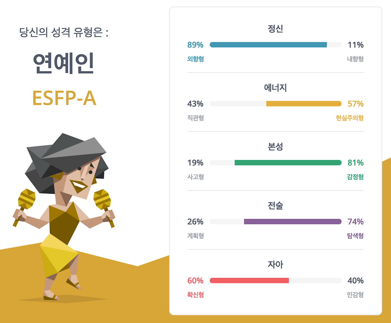 정확히 말하면 제 MBTI는 ESFP-A이지만 마지막 항목에 대해서는 많이들 이야기하지 않고 저 스스로도 잘 모르겠어서 그 부분을 쏙 빼버렸습니다ㅎㅎ