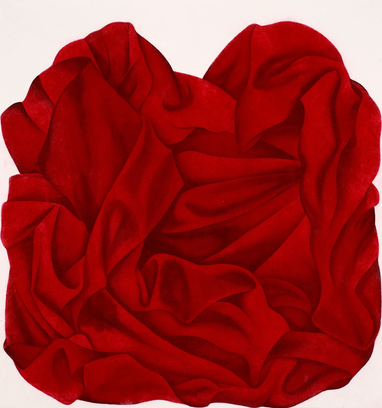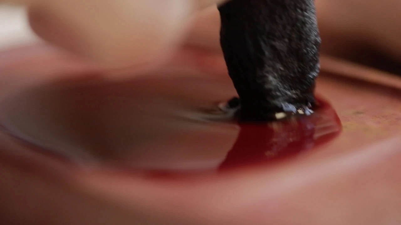 진사 같은 광물 안료는 묵직한 두께감이 있지만 랙과 같은 천연 안료는 수채화 같은 효과를 가져온다. 이렇게 성질이 다른 두 안료를 사용하여 어떻게 붓자국이 전혀 보이지 않는 매끈한 표면을 만들어낼 수 있었을까? 설명이 없다면 판화처럼 보이기도 하고 콜라주처럼 보이기도 한다.