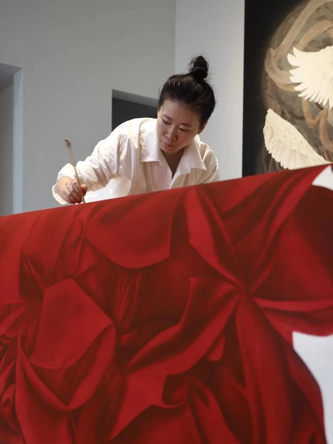 물론 더 인상 깊은 건 그녀의 작품이었다. 캉춘휘는 시중 안료를 절대 사용하지 않고 원료를 직접 채취 및 가공하여 모든 안료를 직접 제작한다. 그녀의 <수미산(Sumeru)> 시리즈 역시 진사 안료와 곤충을 응고한 랙 안료 모두 직접 만들어서 제작한 것이다. 흰색 바탕은 종이색이 아니라 역시 직접 제작한 흰색 안료를 칠한 것이다.
