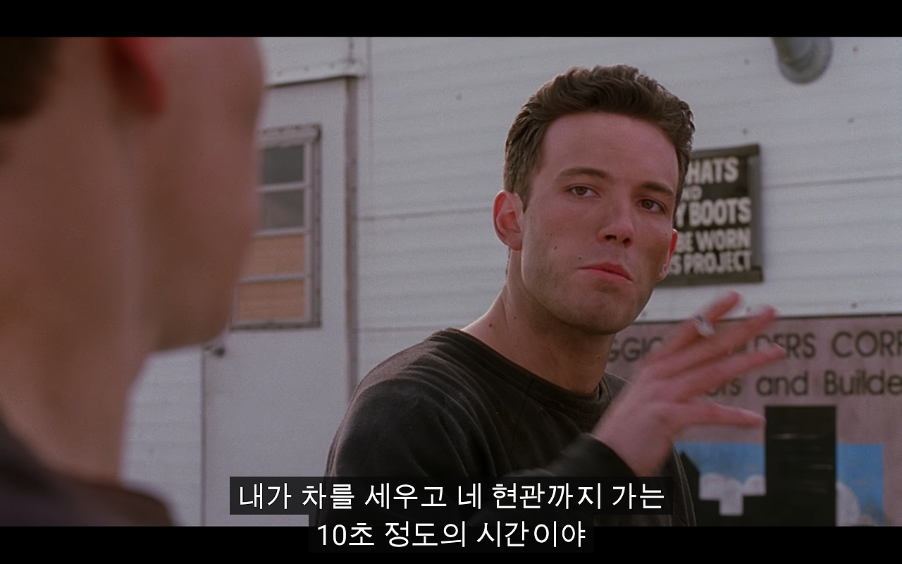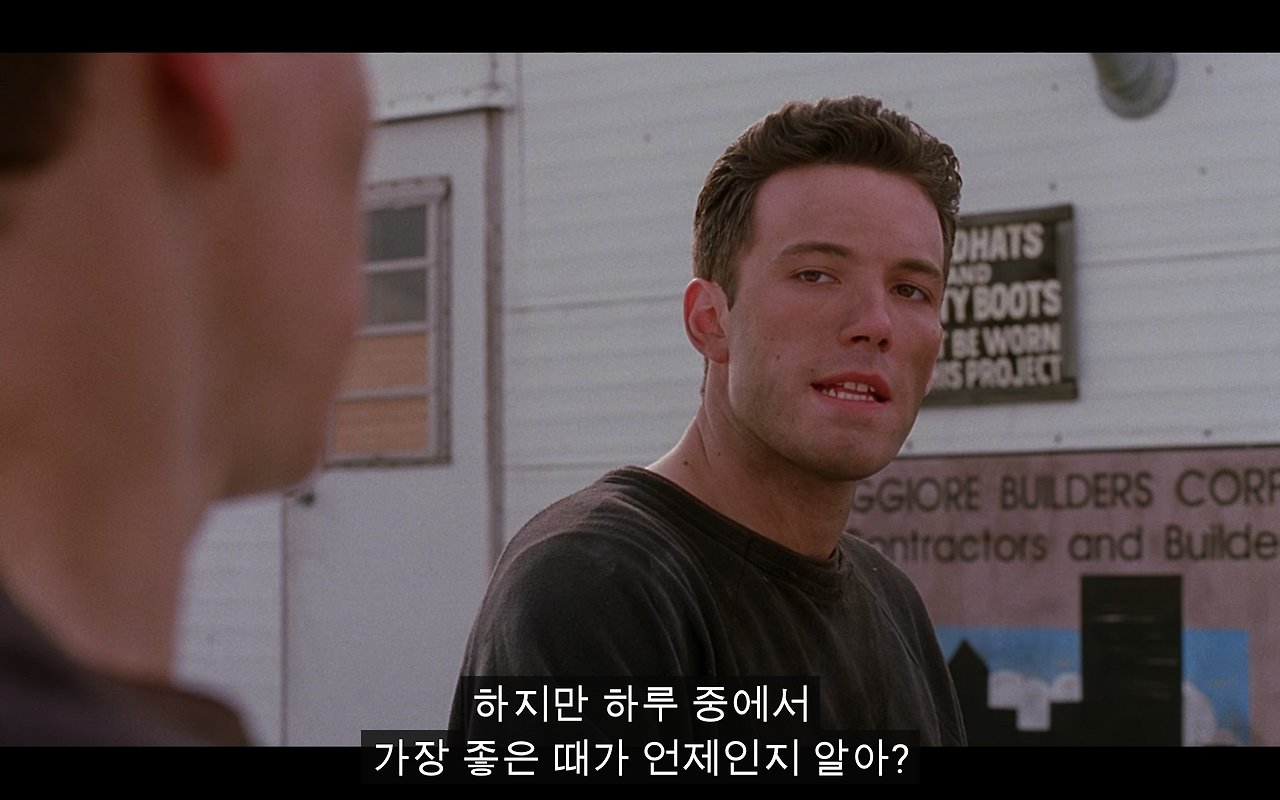 다 마시고 난 빈 맥주 캔을 차 위에 올려두고 안전모와 장갑을 챙겨 자리를 떠나는 처키. 와 저 친구... 얼굴도 훈훈한데 맘씨도... 윌은 참 대단한 친구를 두었네. 그나저나 나한테도 저런 친구가 있었나? 글쎄. 내가 먼저 저런 친구였을까... 뒤이어 숀 맥과이어와 제랄드 램보 교수가 언쟁을 높이는 장면과 목소리들은 머릿속을 채운 이런 생각들로 희미하게 퍼져나갔다.