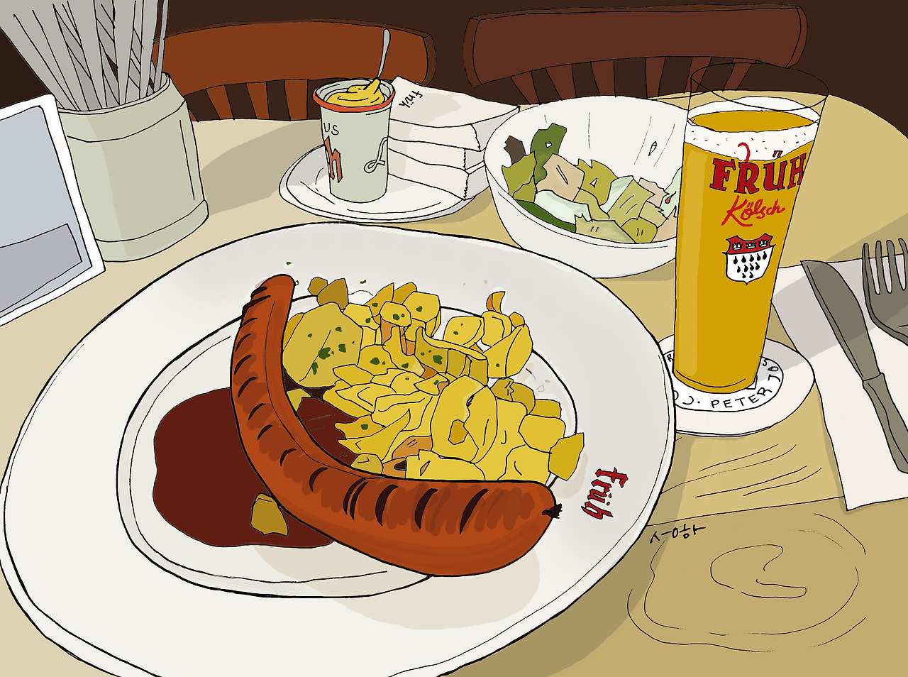 맥주를 마시면서 메뉴판을 보는데 내 눈에 가장 먼저 들어온 'sausage'. 독일에 와서 소시지를 먹지 못했는데 오늘이 그 역사적인 날인가 보다. 담당 직원을 불러 감자를 곁들인 소시지와 함께 쾰쉬 한 잔을 주문했다. 음식을 기다리는 동안 한 모금, 두 모금. 어느덧 잔을 비워버렸다. 빈 잔을 본 직원이 "한 잔을 더?"를 묻자 당연히 좋다고 했다. 잔이 작다 보니 빨리 많이 마시는 사람도 많았고, 그 속도에 맞춰 직원도 빠르게 서빙해주고 있었다. 이를 부담스러워 할 사람도 있겠지만 맥주를 빨리 많이 마시는 내겐 큰 장점이었다. 그 찰나 잠시 잊고 있었던 음식이 내 테이블에 놓였다.