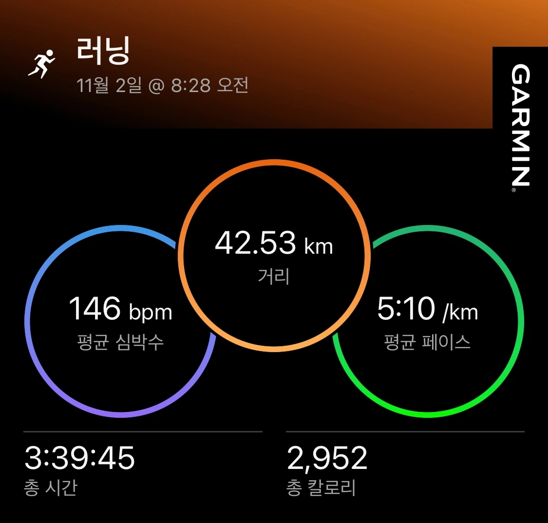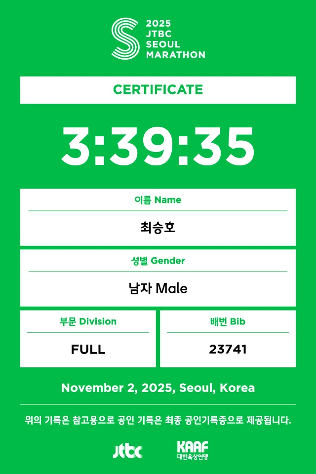 하지만 풀코스 첫 출전의 한계 혹은 부족한 훈련량 때문이었을까. 34킬로미터 지점을 지나며 왼쪽 다리가 무거워졌다. 그렇게 34~35킬로미터에서 517 페이스로 느려졌다. 28km, 35km에서 에너지젤을 먹으며 힘을 내어, 37km 503, 38km 507 페이스로 달렸으나, 마지막에 520 페이스가 되며 42,195km를 평균 510 페이스로 마무리했다. 마라톤 풀코스 첫 도전에 3시간 39분 35초를 기록했다.