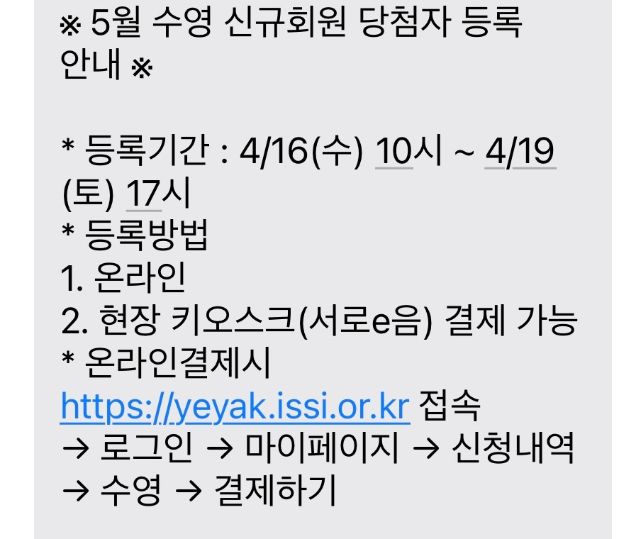 우리 부부는 4월 체육문화센터 수영을 신청했는데 나는 떨어지고, 아내만 붙어서 결국 등록을 포기했다. 그런데 오늘 5월 체육문화센터 수영 발표날에 우리 부부 둘 다 붙었다. 역시 럭키!!