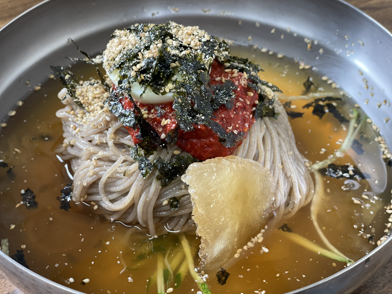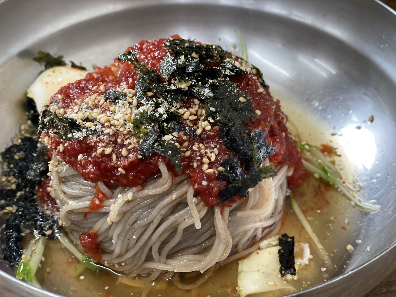 아울렛으로 향하던 중, 서로의 배에서 꼬르륵 소리가 났다. “아울렛에 가서 먹을까? 강원막국수 갈까?”, “오랜만에 매콤 새콤한 막국수 한 그릇 고!”라고 외친 뒤 아울렛 가기 전에 늘 아이들과 방문했던 김포 강원막국수에 방문했다. 평일 1시가 넘었음에도 주차장에는 주차되어 있는 차들이 많았다. 역시 맛집!