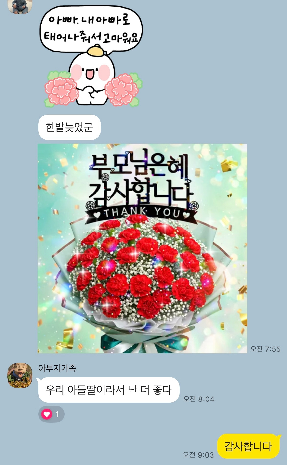 어버이날 아침 우리 가족 채팅방, 흔하디 흔한 가족 채팅방이다. 여동생의 '부모님 은혜 감사합니다' 이모티콘을 시작으로 '우리 아들딸이라서 난 더 좋다'는 아버지의 답장, 바로 읽었지만 아이들 등교, 등원에 정신없어 한 시간 뒤에 별다른 말없이 '감사합니다'로 마무리한 나의 카톡 답장.