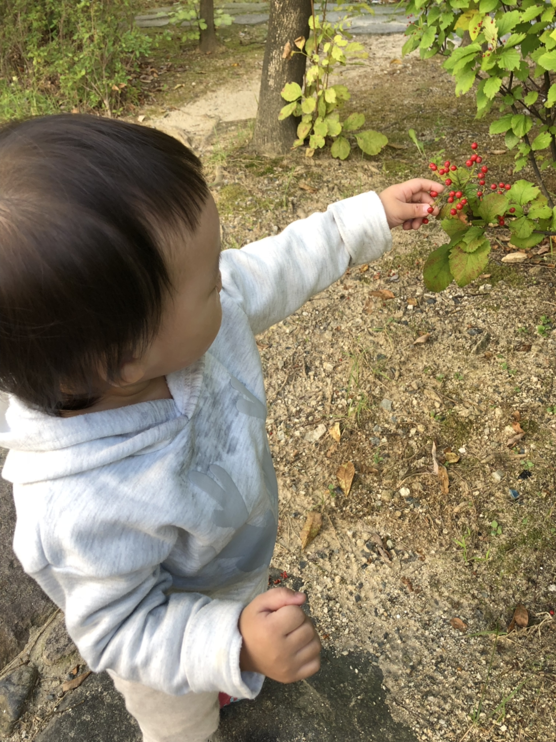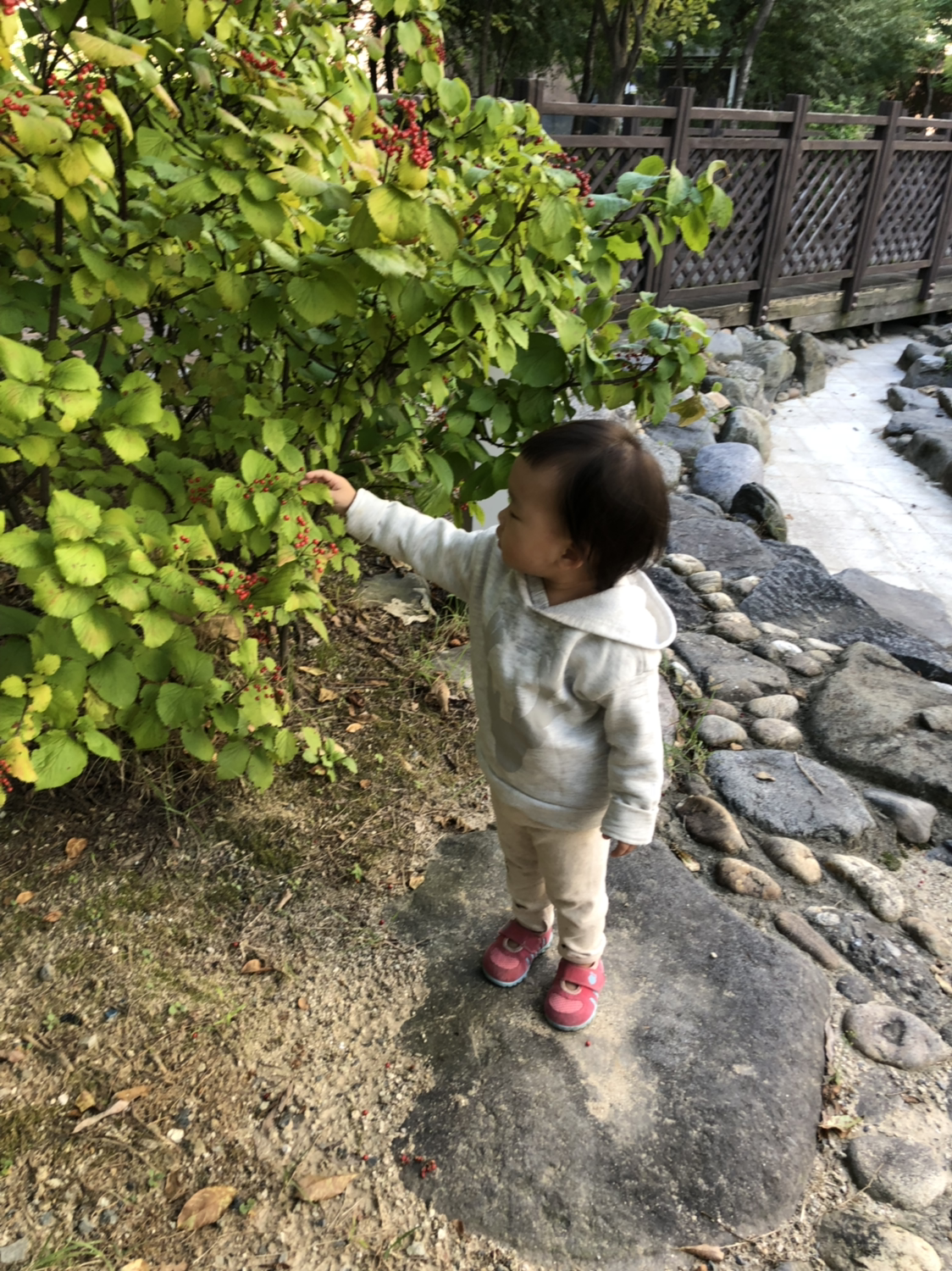 여기 열매 있다. 예쁘지? 하고 말하니 아이는 관심을 보이며 다가섰다. 조심스레 열매를 만져보다가 하나를 따서 내 손바닥에 놓아주었다.