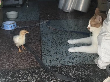 아주머니는 그 뒤로도 한참동안 ‘동생’을 괴롭히지 말라며 고양이를 호되게 야단쳤고, 그 이후로 고양이 언니(?)와 병아리 동생(?)은 사이 좋게 살아가게 되었다는 이야기.