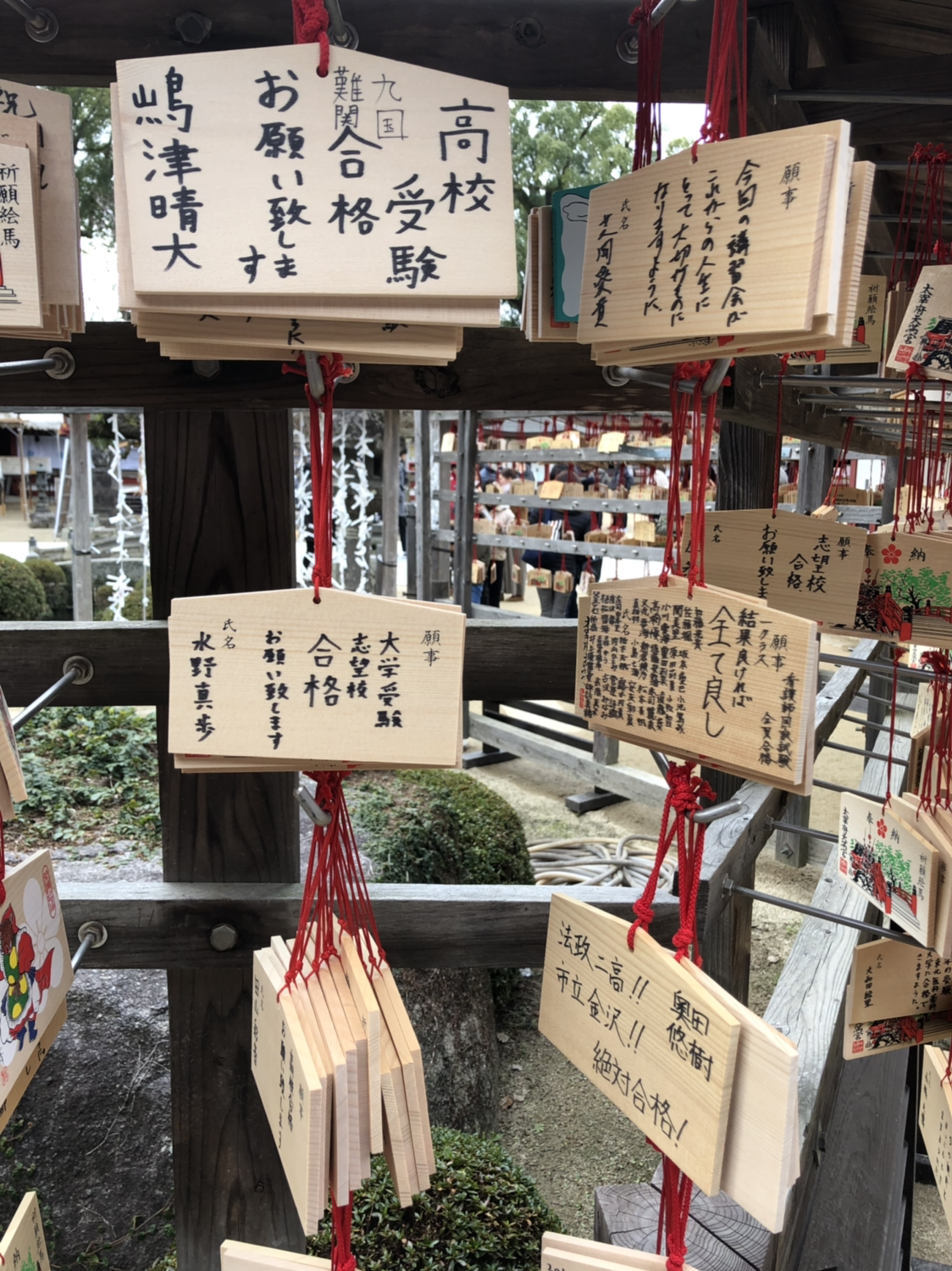 신사 안에는 나무 판자에 기원을 적어서 걸어놓는 에마가 가득했다. 후쿠오카대학에 꼭 합격하게 해주세요. 부탁드립니다. 카나자와 시립대학 절대 합격! 한글자 한글자 또박또박 적혀있는 글씨들을 보니 간절한 마음들이 느껴져서 뭉클했다. 내가 수험생이던 시절도 생각나고. 다들 원하는 대로 잘 되었으면 좋겠다고 생각했다. 나도 한 장 적었다. 우리 애들 노벨상 받게 해주세요.