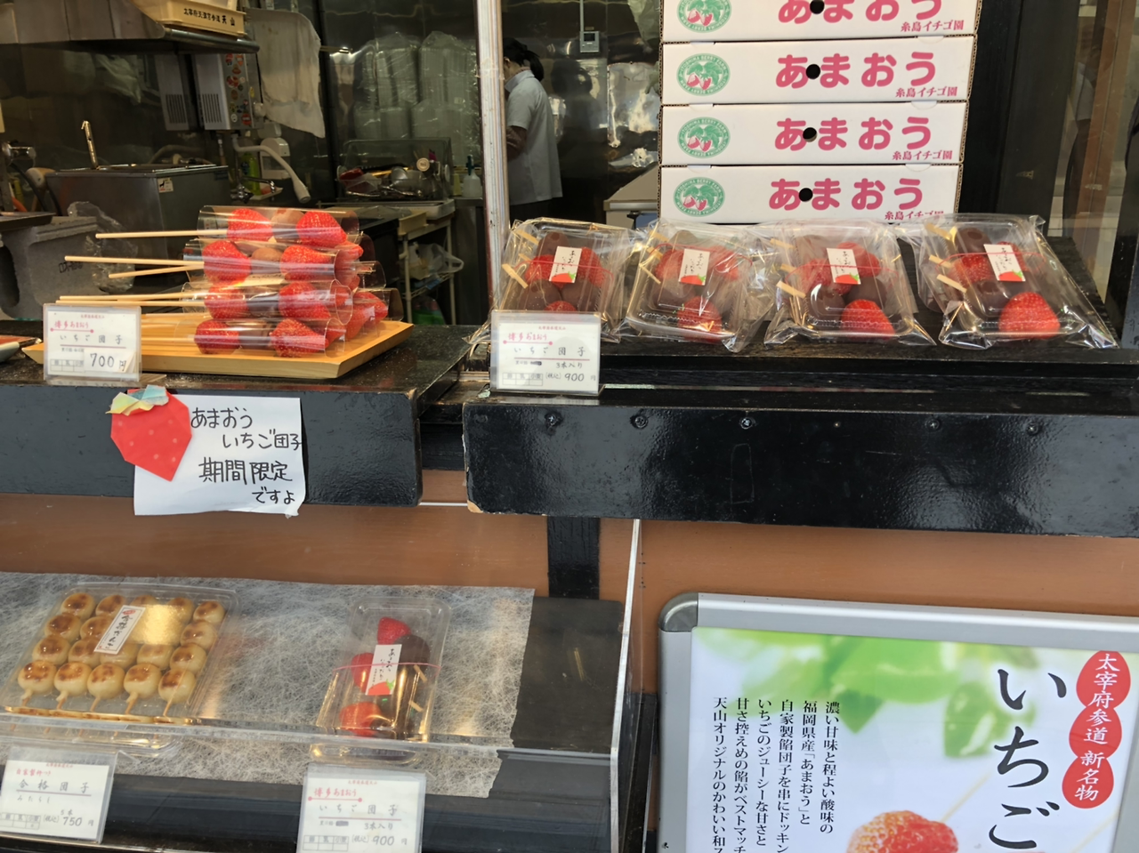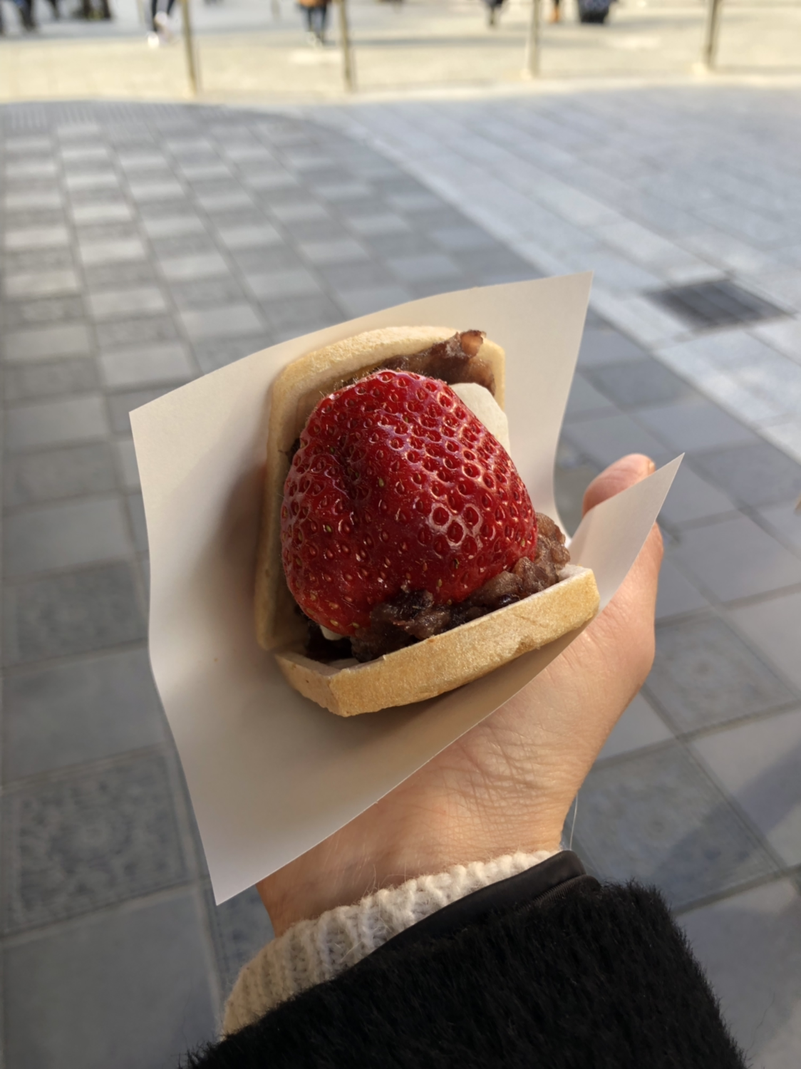 떡 먹고 돌아나가는 길에는 지나가던 일본 여자애 둘이 아, 이거 인스타에서 봤어. 엄청 맛있다면서!! 앙~~~ 모양도 너무 귀여워! 하고 이야기하는 소리가 들려서 봤더니 찹쌀떡을 반으로 쪼개 팥앙금을 끼우고 그 위에는 커다란 딸기(후쿠오카 특산 딸기인 아마오우)를 올린 디저트가 있었다. 여자애들을 따라 잠깐 줄을 섰다가, 특이하긴 하지만 뭐 그래봤자 내가 아는 딸기맛이겠지 싶고, 딸기랑 떡이라니 뭔가 미묘하게 수상쩍은 느낌이 들고, 점심을 맛있게 먹으려면 더 이상 간식을 먹으면 안될 것 같아 그냥 돌아나왔다. 그런데 버스를 타러 걸어가는 길에 뭔가 환청이 들리는 것이다. 이거 엄청 맛있다면서!!!! 엄청 맛있다면서!!!! 엄청 맛있다면서!!!! 엄청 맛있다면서!!!!
