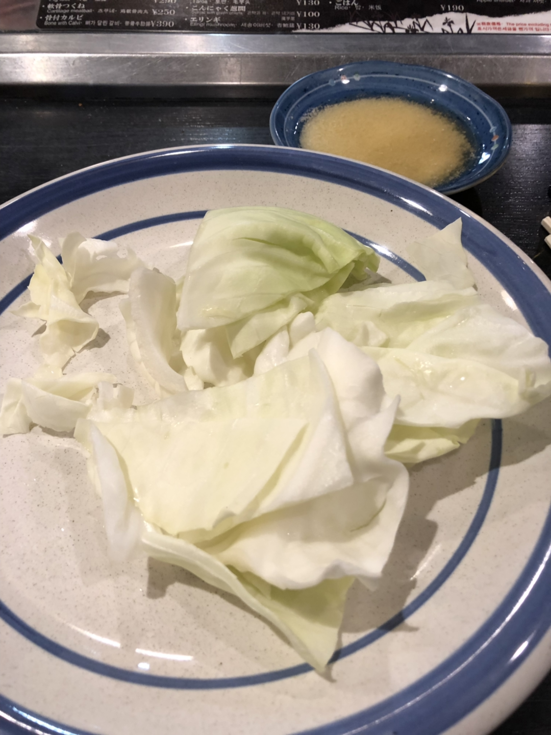 손님이 가득 차 있는 걸 보니 맛이 나쁘진 않겠군. 기대가 된다. 이 집은 기본으로 양배추를 주는구나. 생으로 먹기에 양배추만한 채소가 없지! 땅에서 바로 캐낸 듯한 신선한 양배추! 아삭아삭한 잎사귀를 적당히 잘라 특제소스에 찍어서 먹으면!!! 아, 입 안이 싱그러움으로 가득찬다!! 역시 오길 잘했어. 그럼 어디 한번 시작해볼까?