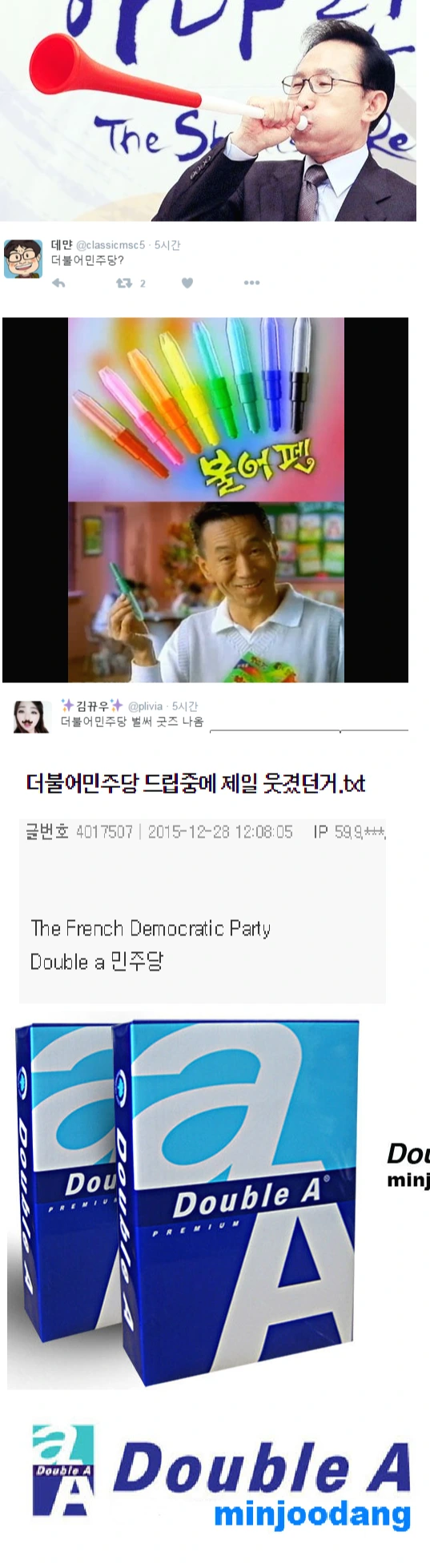 당연하게도 두 당의 '민주당 이름 지키기' 싸움에 '이름보다 내용이 중요하다'는 선비님 공자왈 같은 비판이 쏟아지고 있다. 일각에서는 "안철수 의원이 탈당했으니 내용이 바뀐 것 아니냐"며 당명 개정이 정당하다는 반론도 나온다. 안 의원은 "이제 안철수없당이다" "더불어터진당"과 같은 트위터 드립을 구사하며 기자들을 당혹스러운 유모어 천국으로 인도하고 있다.