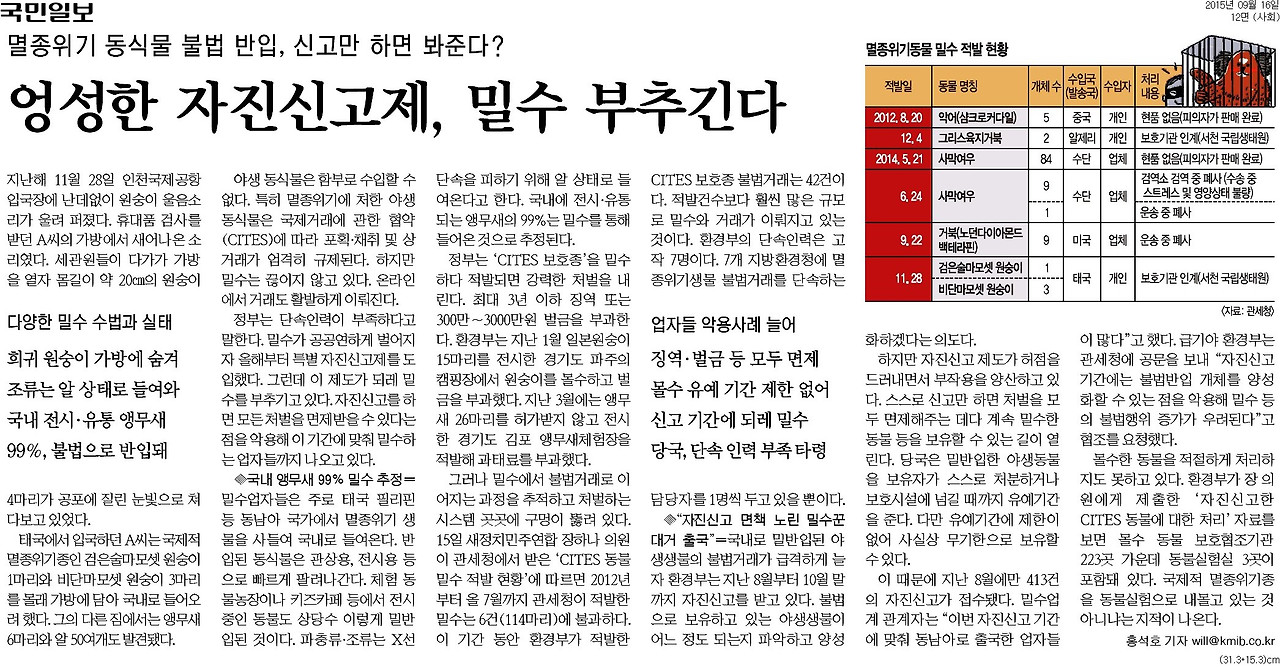 장 의원이 국회 환경노동위원회(환노위)에 소속돼 있는 만큼 의원실 실무진은 '환경'과 '노동' 분야로 나뉘어 있었다. 환경 정책을 담당하던 박모 비서는 '멸종위기종 밀수입' 문제를 쫓고 있었다. 밀수업자들이 동남아 국가에서 희귀 원숭이와 앵무새 등을 몰래 수입해 불법거래를 하는데 정부가 사실상 방치했다는 것이다. 그는 돌고래 학대 문제도 다뤘다. 쇼에 동원된 돌고래들이 부당하게 거래됐고 제대로 관리되지 않았단 내용이었다. 박 비서는 열정적으로 자료를 뒤적거리며 환경 정책의 부당함을 설명했다.