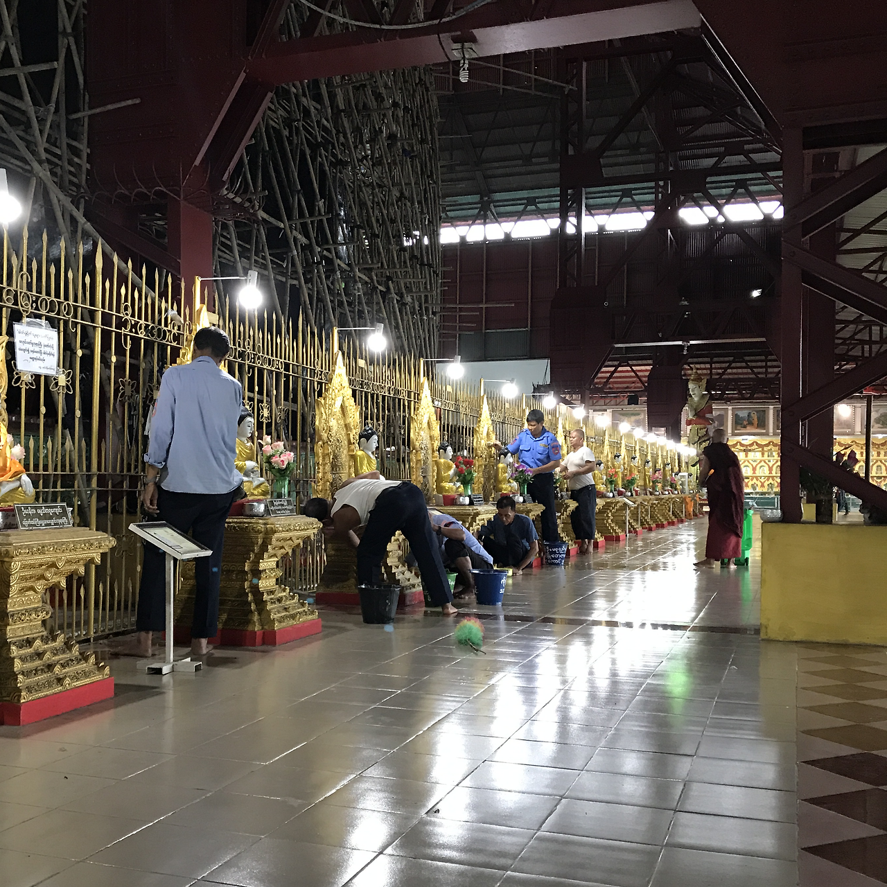 불상을 따라 한 바퀴를 도는 중에 뒤편에서 책을 읽는 미얀마 청년을 보았다. 괜스레 책이 읽고 싶어졌다. 불상 앞에 앉아 책을 읽는데 저 멀리 사원을 청소하는 사람들이 보인다. 열심을 다해 쓸고 닦는 모습에 넋을 놓고 있는데 사원 밖으로 거센 비가 쏟아진다.