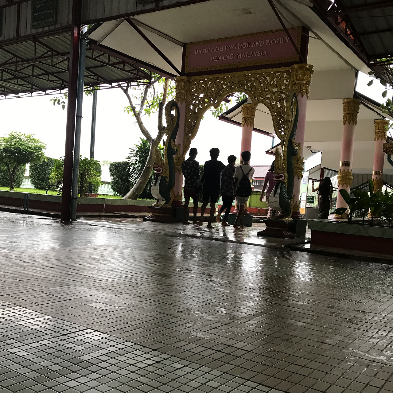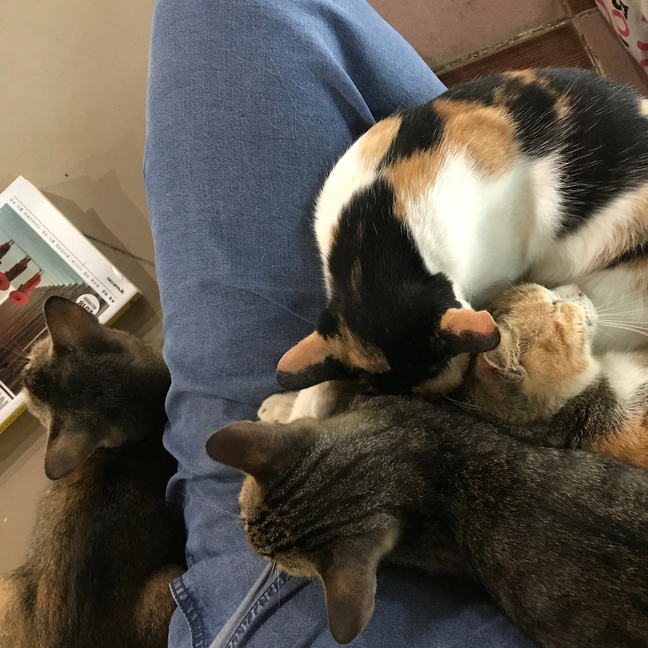 한 스님이 지나가며 20분이면 멎을 거랬는데 빗줄기가 길다. 1시간은 족히 앉아있던 것 같다. 책을 읽다가, 사원에서 비를 피하는 10대 아이들과 까르르 웃다가. 고양이들은 아무 생각 없이 내 품에서 잔다. 바삐 구경하고 사진을 찍어 기록하는 여행과는 다르다. 안 그래도 느리게 가는 시간이 더 느리다.