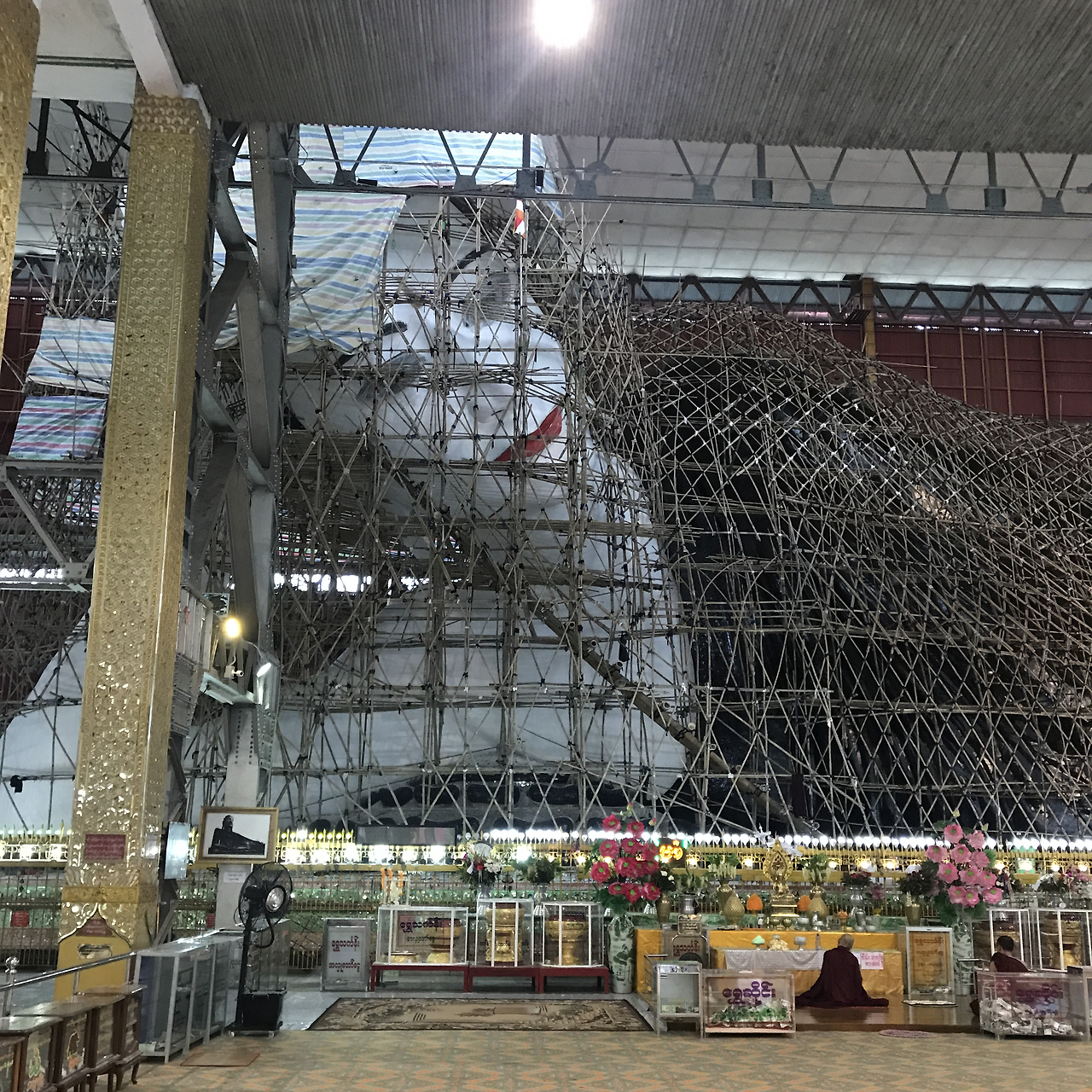 뭐, 어쨌든 이 호구는 편하게 차욱타지 파고다에 도착했다. 보수공사 중이라 온 몸에 침을 맞은 듯한 불상이 눈앞에 나타났고 허무함이 찾아왔다. 아 약간의 무서움도 있었다. 아마 크기가 주는 압도감과 경외감 없는 나의 태도에 대한 응징이었으리라.
