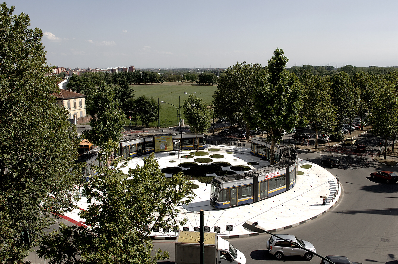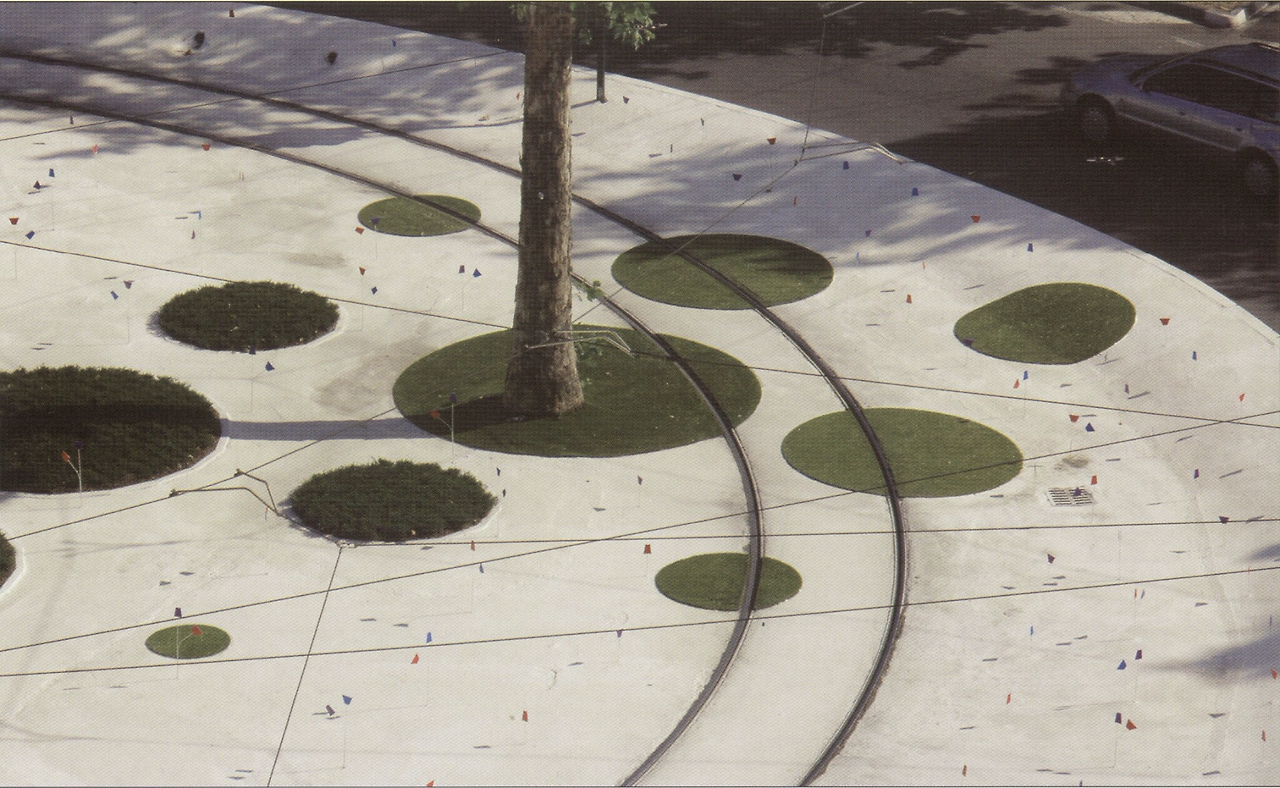 경전철이 지나가는 철로의 바닥을 원형으로 만들고 그위에는 더 작은 원을 몇개 '얹고'초록색으로 채운다. 철로가 '밟고'간다. 같은 원이로되 서로 다른 두개의 레이어가 겹쳐있다.