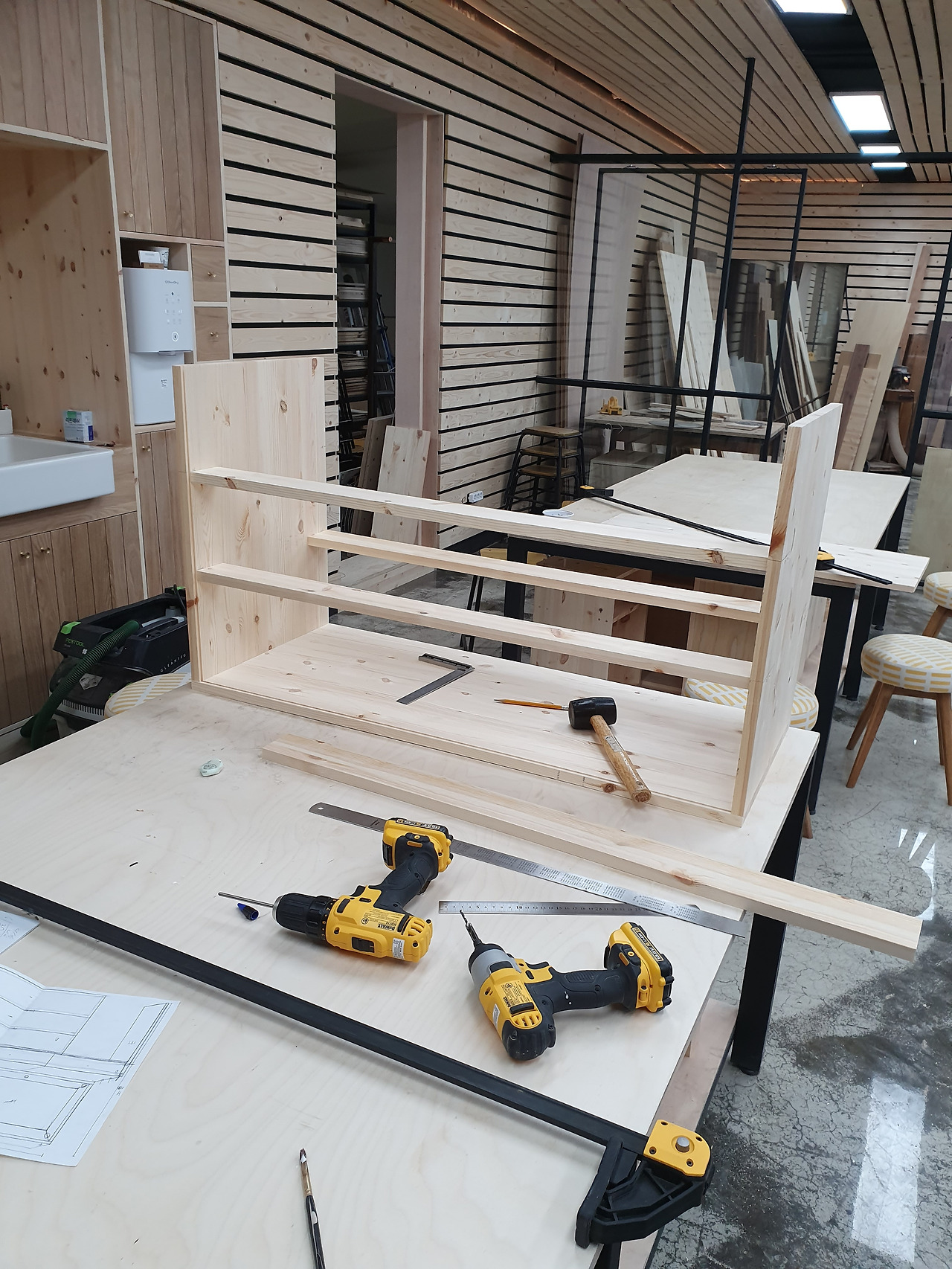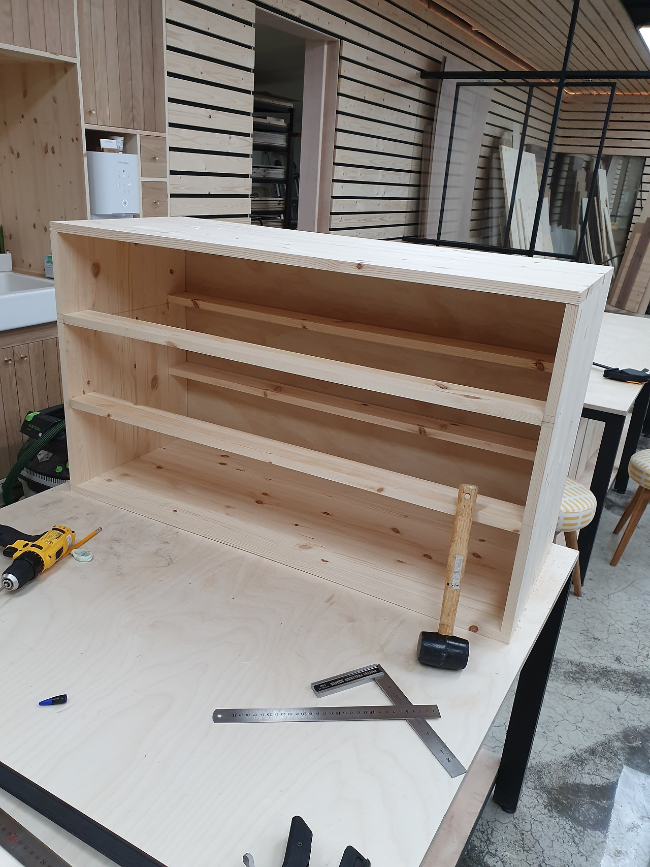 간단해 보이는 작업에서 꽤나 오랜 시간을 보냈다. 타카를 박지 않고, 도미노(나무와 나무 사이에 목심을 껴 바깥에서 볼 때 피스 자국이나, 목심 등이 보이지 않는 것)로 작업하다 보니, 사소한 문제들이 생겼다. 결국 기존 생각했던 것보다 약간 사이즈를 줄여 제작에 들어갔다.