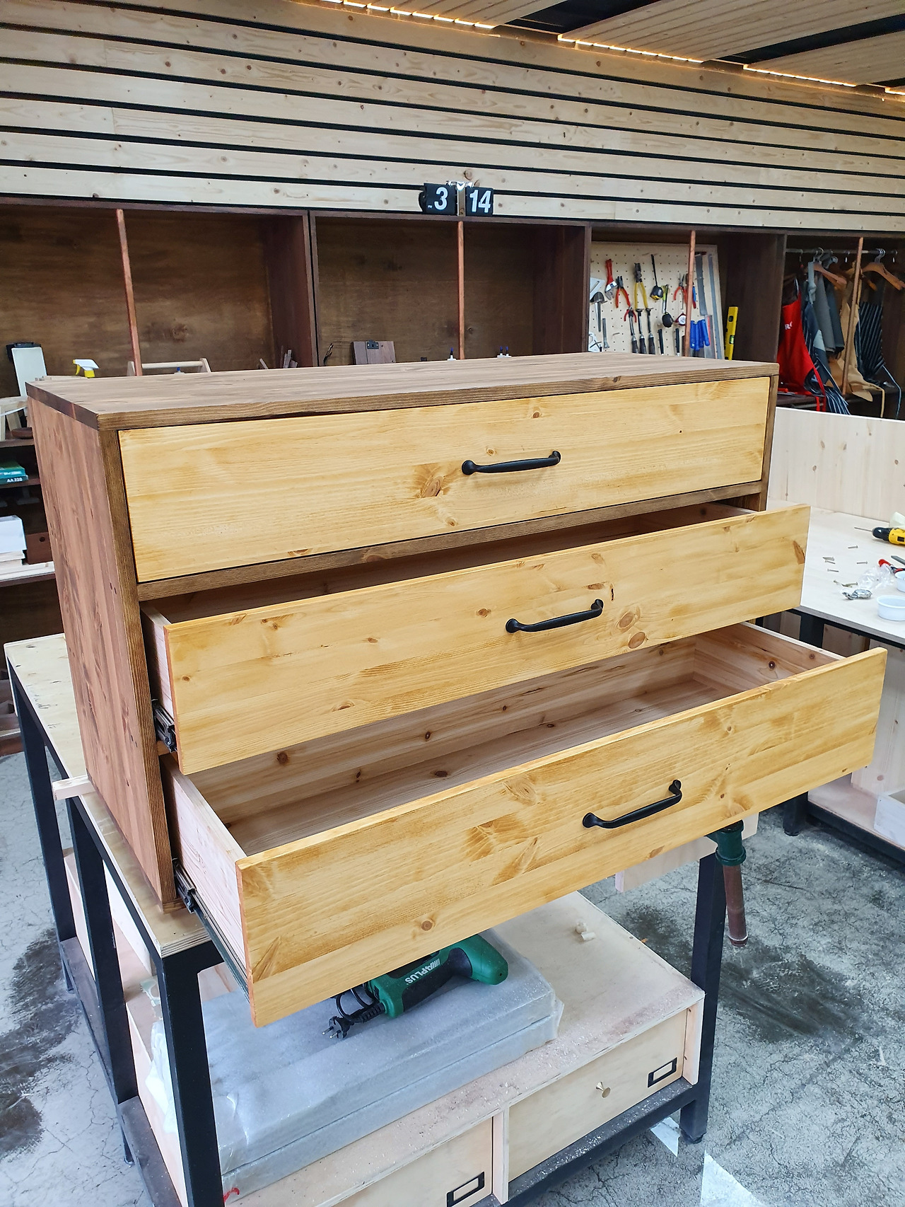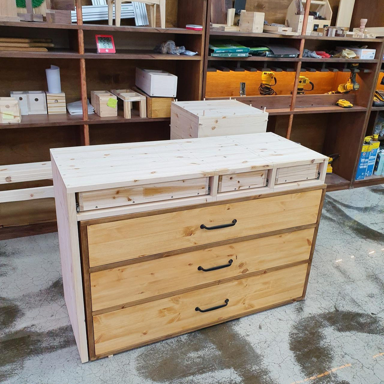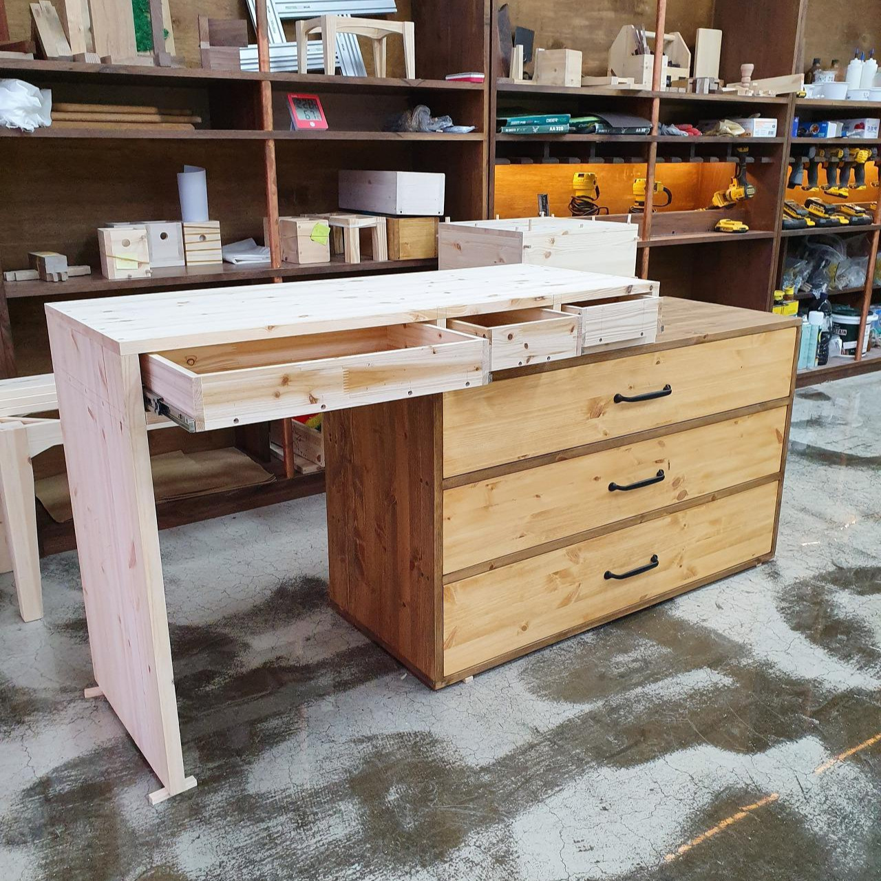 도장이 마르는 데에는 꼬박 하루가 걸린다. 그뿐인가. 바니쉬(가구 방수작업)도 발라주어야 하기에 꽤나 오랜 시간이 지나야 완성이 될 것이다. 그대로 기다릴 수는 없으니, 다리 겸 화장대의 밑판을 만들기로 했다. 서랍장은 역시 삼나무로 하고, 가구를 만들어 나간다. 견고함을 위해 다리는 24T 두께로 제작하고, 이내 도장까지 완성하니 얼추 화장대의 모양을 잡아간다. 가구에 어울리는 손잡이도 직접 골라, 서랍에 달아봤다. 퍽 잘 어울려 기분이 좋다.